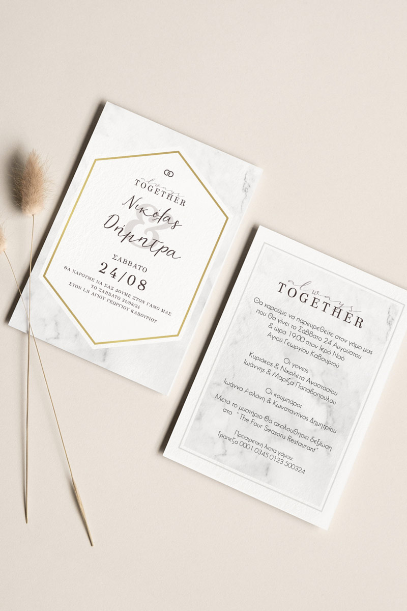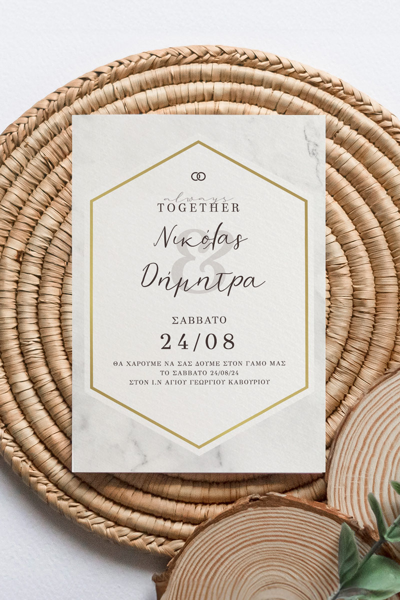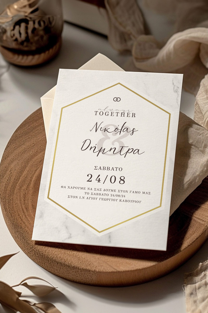 Αποκτήστε τα προσκλητήρια γάμου με σχέδιο Minimal Elegance. Οι πελάτες μας τα ξεχωρίζουν για το υψηλής ποιότητας ιταλικό χαρτί και την εκτύπωση υψηλής ευκρίνειας Myikona High Definition. Διαθέσιμα σε διαφορετικές διαστάσεις.
