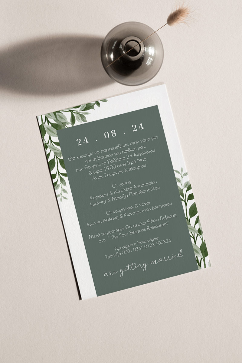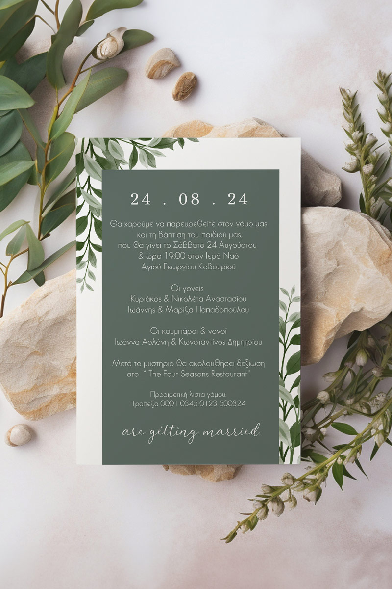 Αποκτήστε τα προσκλητήρια γάμου με σχέδιο Minimal Elegance. Οι πελάτες μας τα ξεχωρίζουν για το υψηλής ποιότητας ιταλικό χαρτί και την εκτύπωση υψηλής ευκρίνειας Myikona High Definition. Διαθέσιμα σε διαφορετικές διαστάσεις.