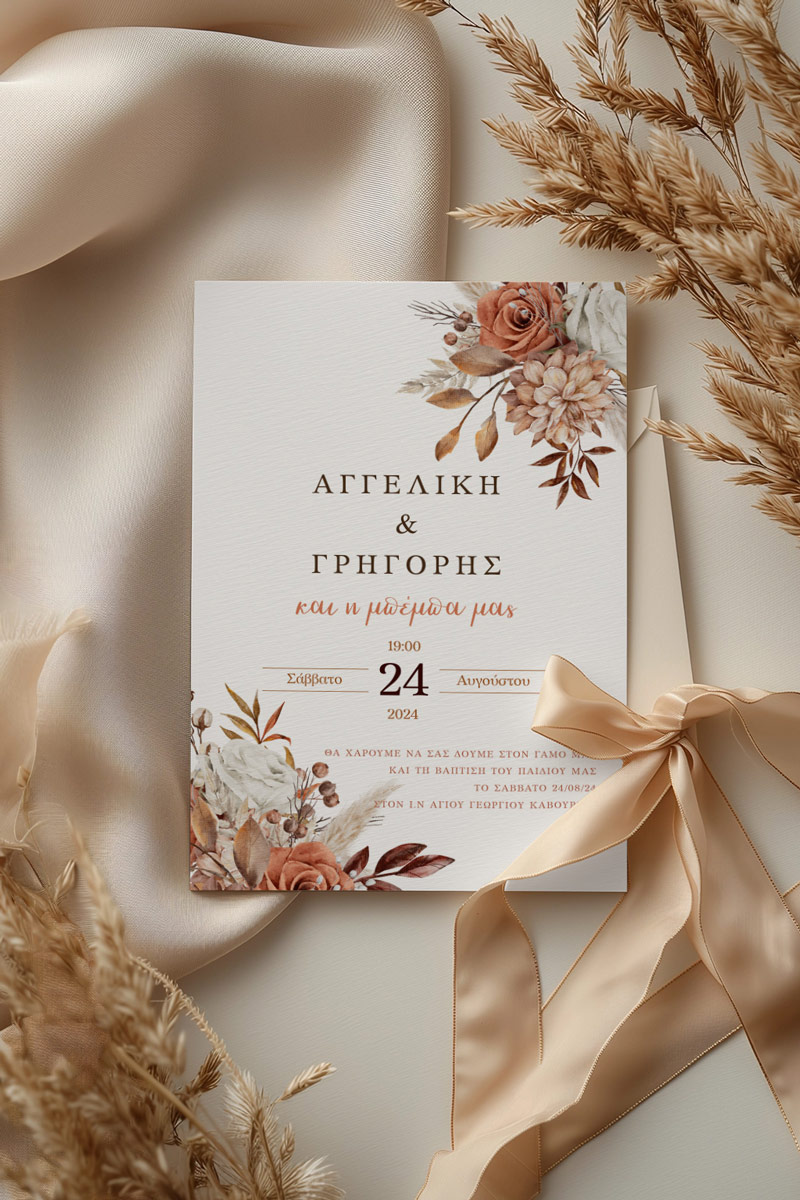 Αποκτήστε τα προσκλητήρια γάμου με σχέδιο Boho Κόκκινα Λουλούδια. Οι πελάτες μας τα ξεχωρίζουν για το υψηλής ποιότητας ιταλικό χαρτί και την εκτύπωση υψηλής ευκρίνειας Myikona High Definition. Διαθέσιμα σε διαφορετικές διαστάσεις.