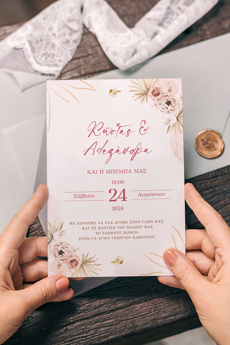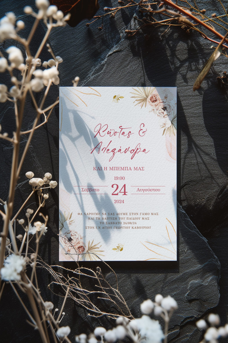 Αποκτήστε τα προσκλητήρια γάμου με σχέδιο Boho Κόκκινα Λουλούδια. Οι πελάτες μας τα ξεχωρίζουν για το υψηλής ποιότητας ιταλικό χαρτί και την εκτύπωση υψηλής ευκρίνειας Myikona High Definition. Διαθέσιμα σε διαφορετικές διαστάσεις.