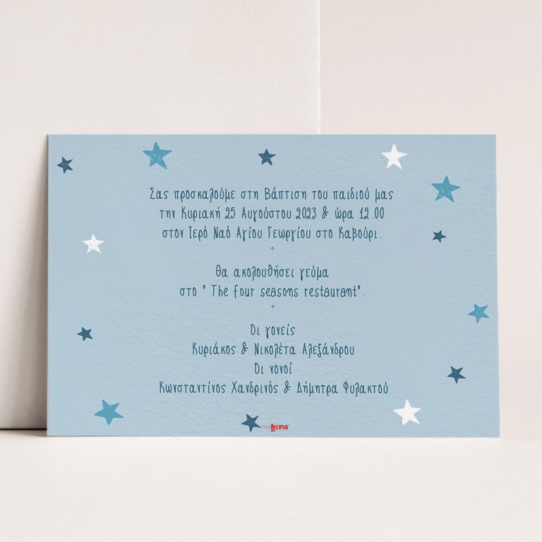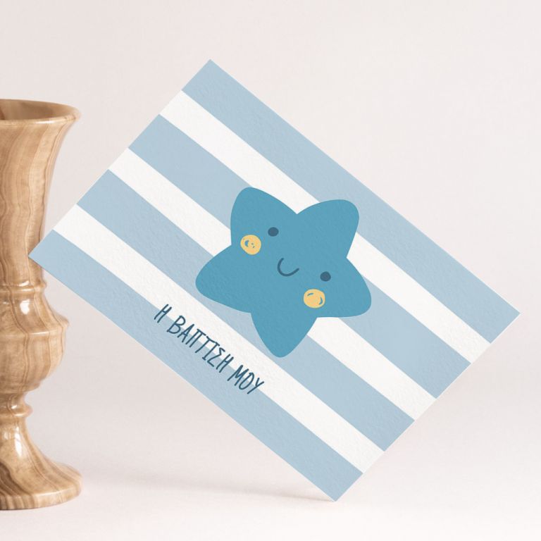 Αποκτήστε τα προσκλητήρια βάπτισης για αγόρι με σχέδιο Blue Starfish. Ξεχωρίζουν για το ανθεκτικό και ποιοτικό χαρτί τύπου Opalina και την εξαιρετική Myikona High Definition εκτύπωση. Δημιουργήστε εύκολα, γρήγορα και οικονομικά τα δικά σας προσκλητήρια!