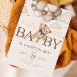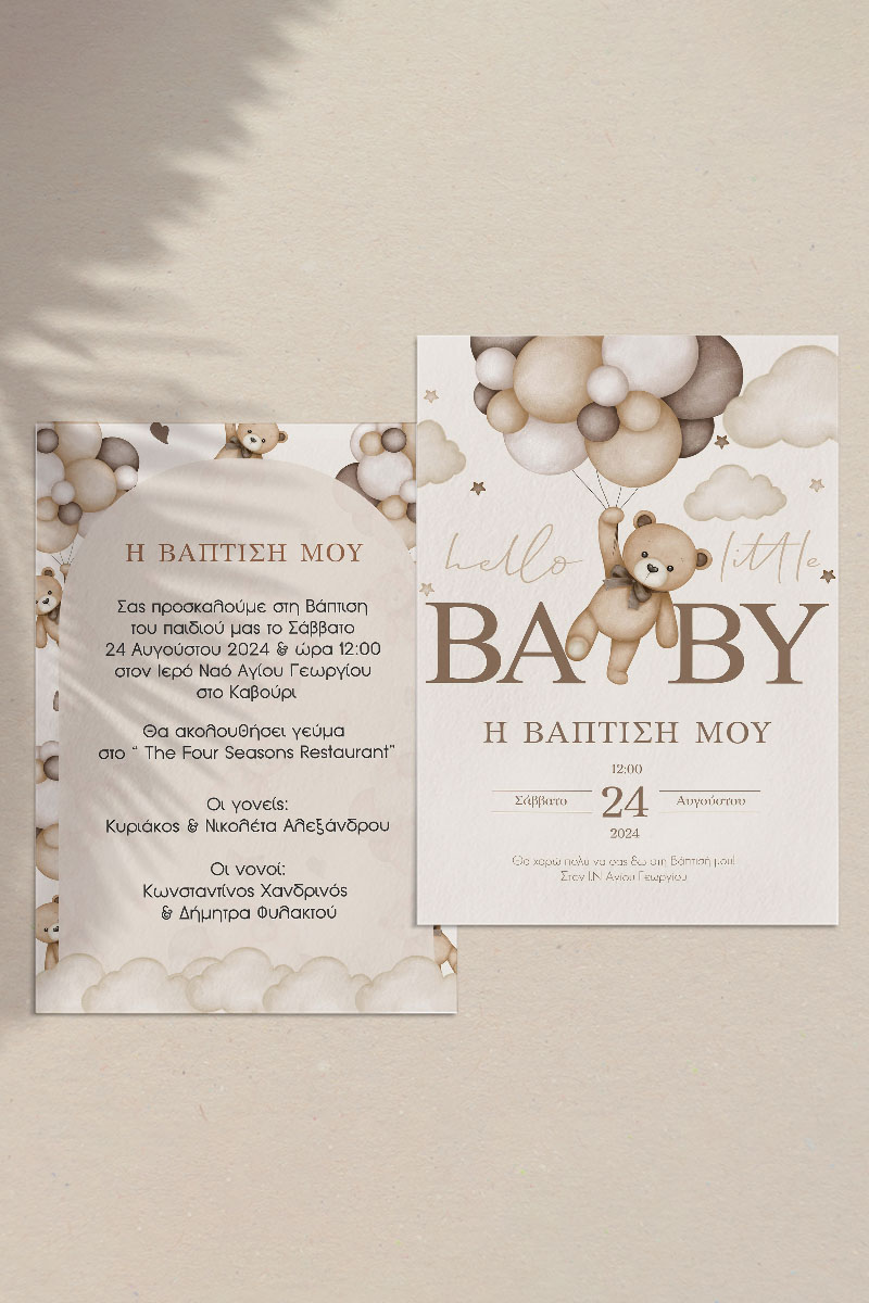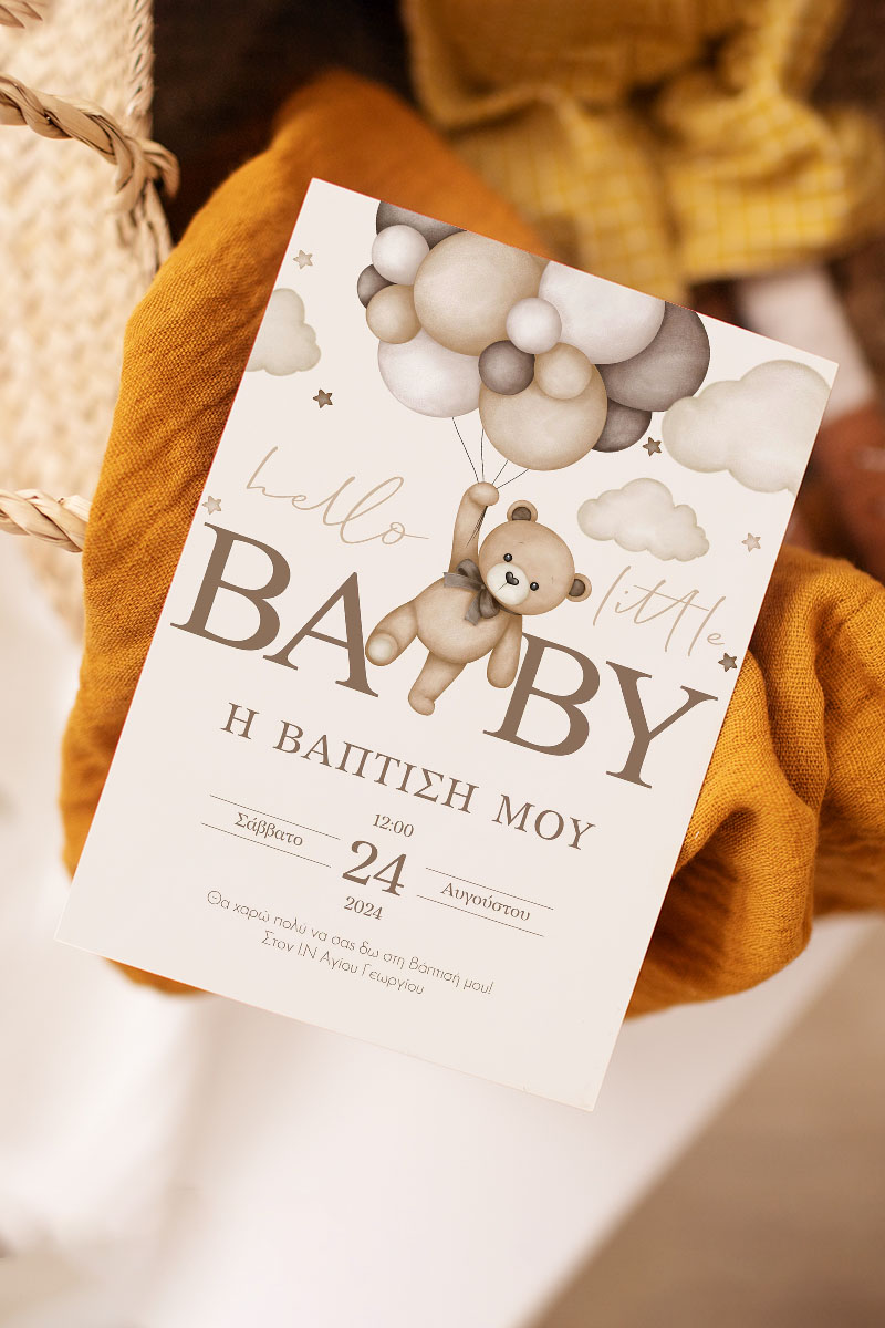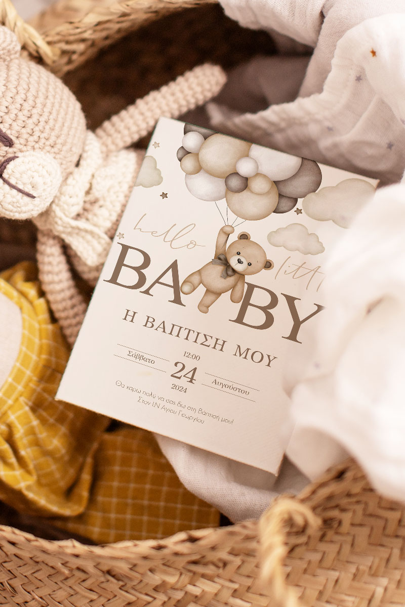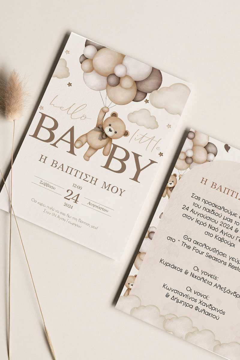 Κάθε λεπτομέρεια μετράει στην πιο όμορφη στιγμή της ζωής σας. Αυτό αντικατοπτρίζεται στα Προσκλητήρια Βάπτισης με σχέδιο Αρκουδάκι με Καφέ Μπαλόνια, τα οποία χρησιμοποιούν υψηλής ποιότητας ιταλικό χαρτί και Myikona High Definition εκτύπωση. Διαθέσιμα σε διαφορετικές διαστάσεις.