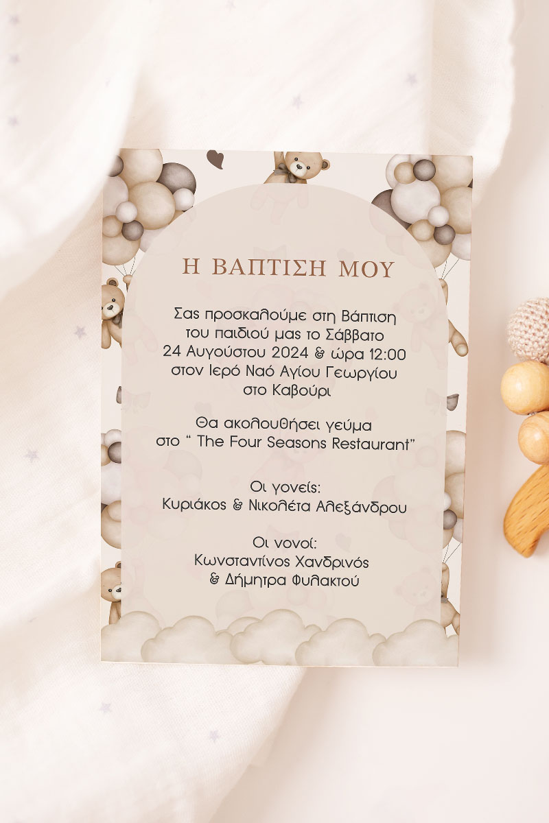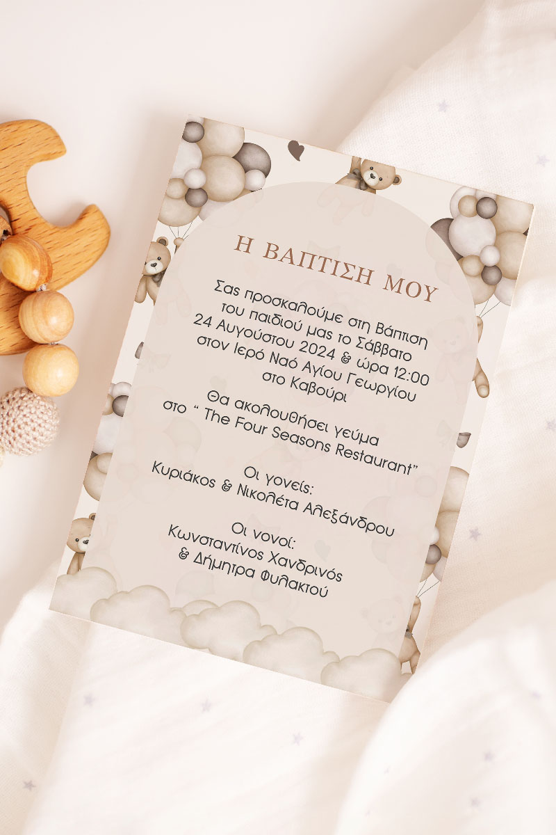 Προσκλητήρια Βάπτισης με σχέδιο Αρκουδάκι με Καφέ Μπαλόνια