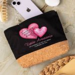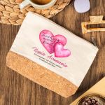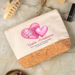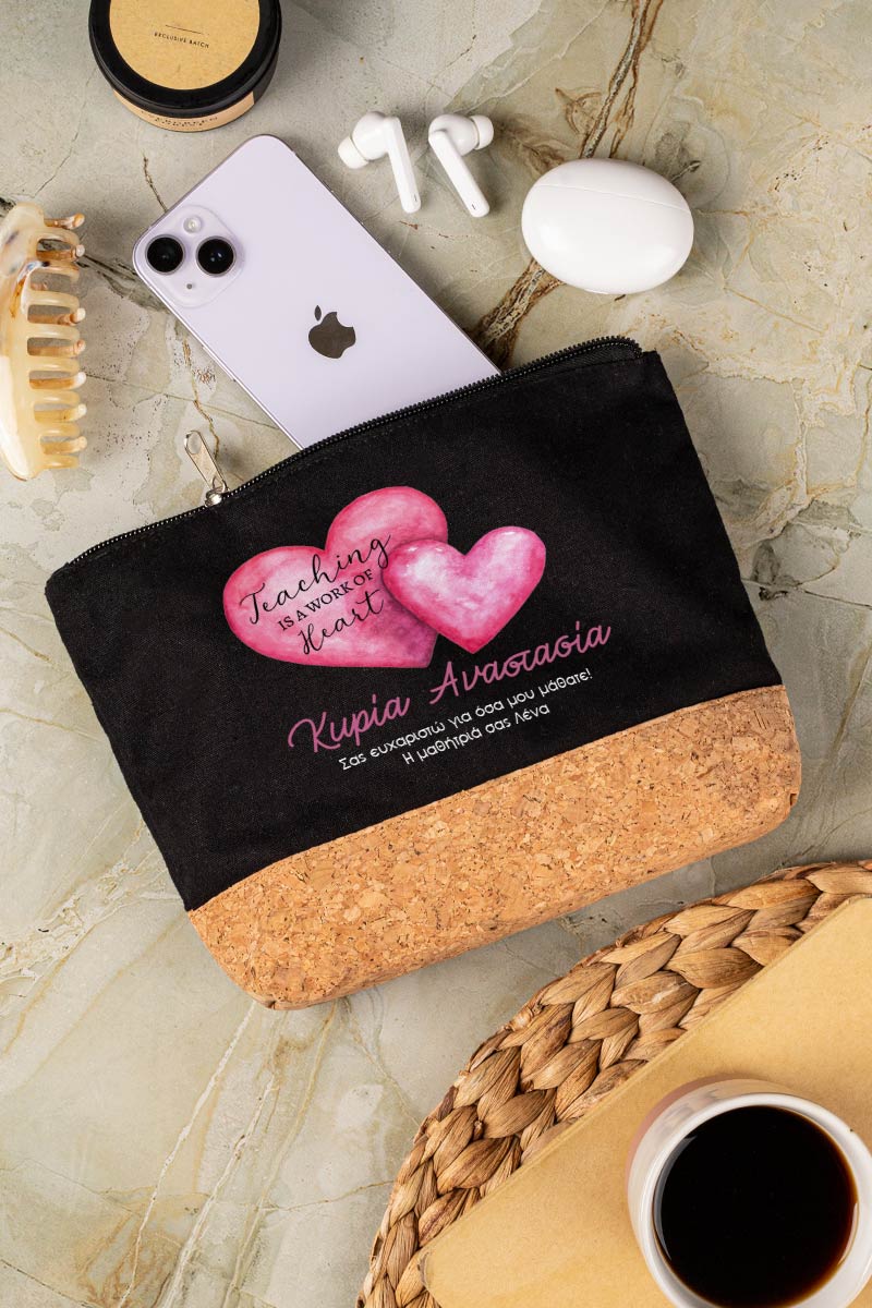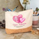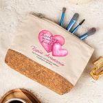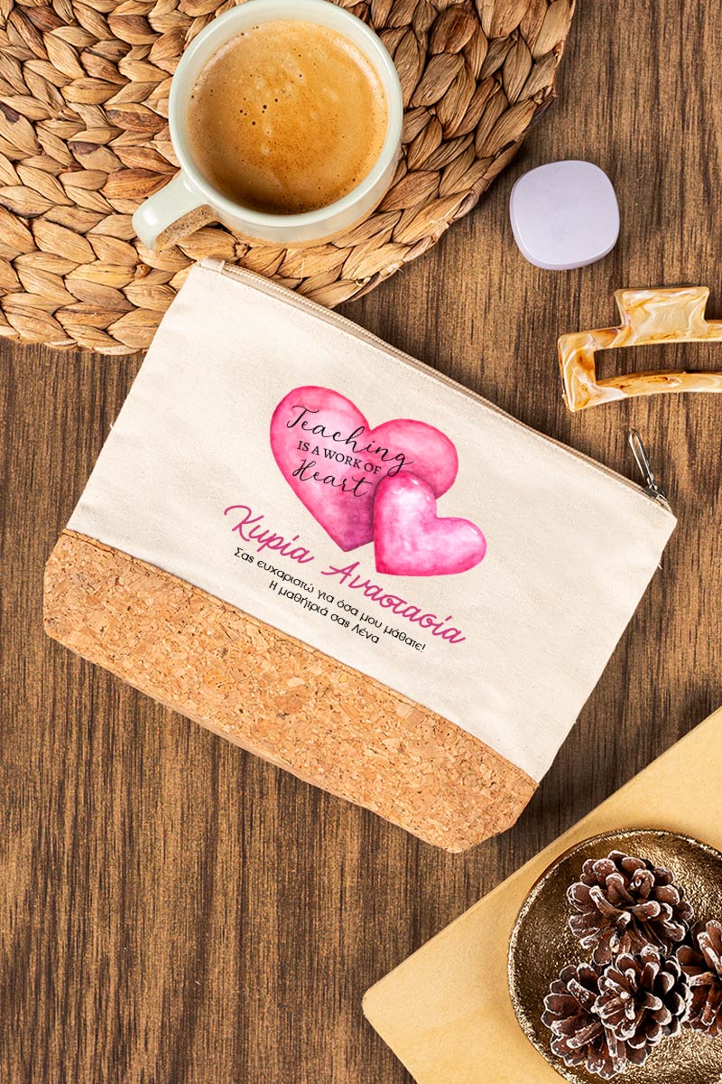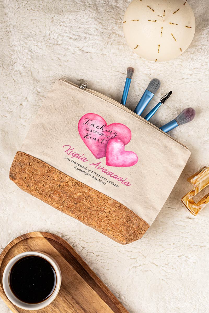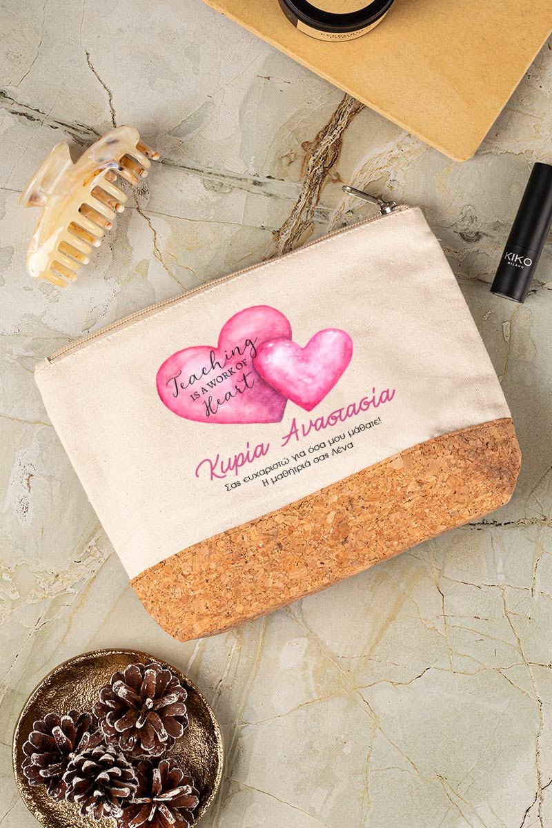 Προσωποποιημένο Εκρού Τσαντάκι & Νεσεσέρ Καλλυντικών με φελλό Ροζ Καρδιές