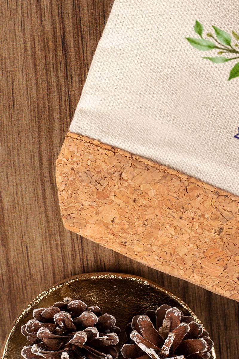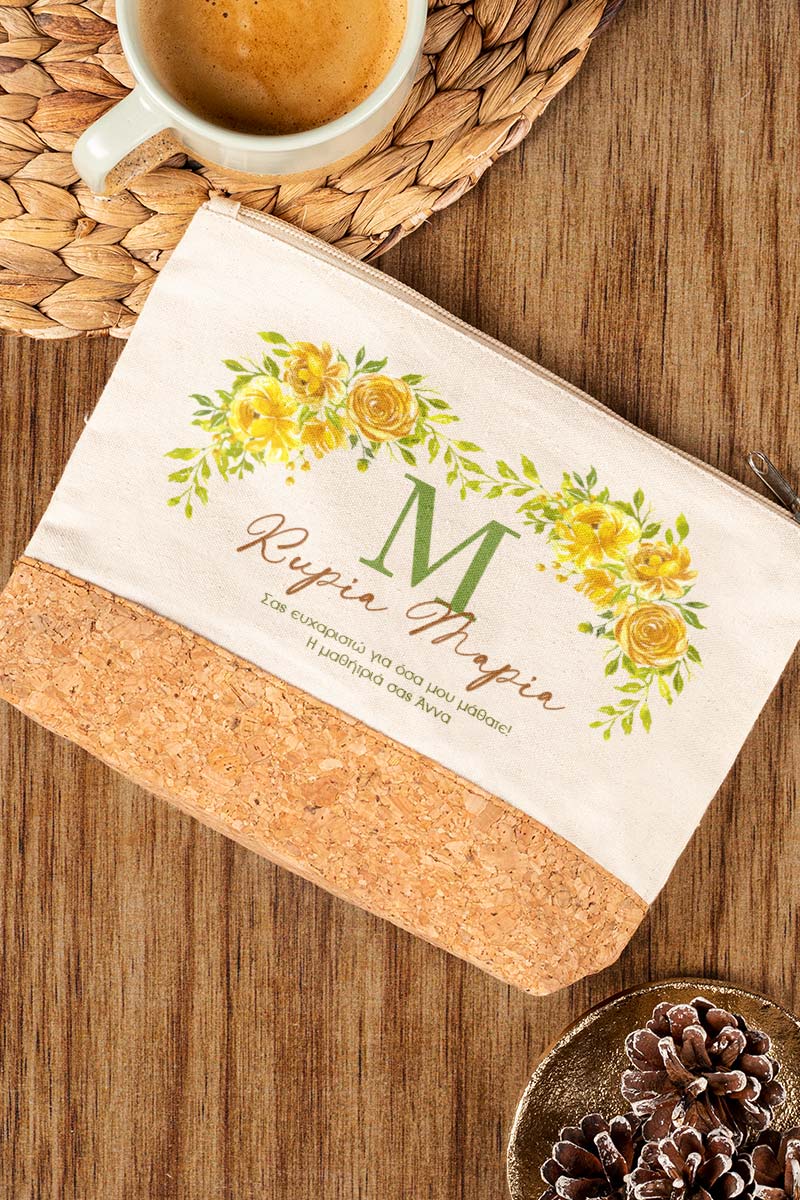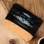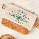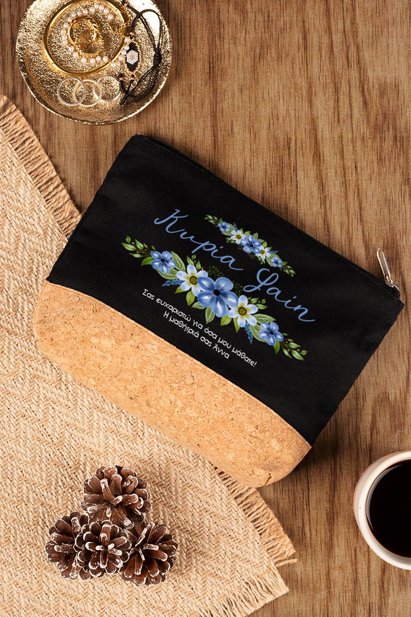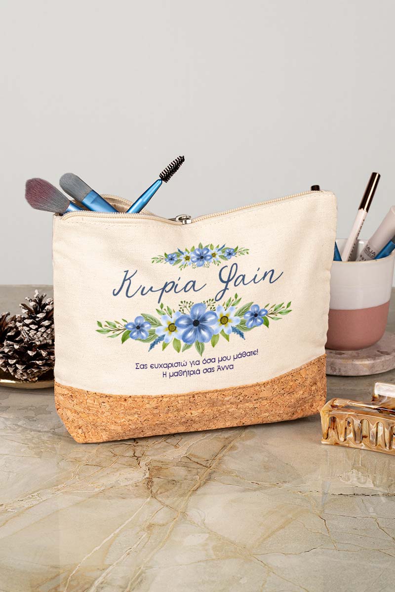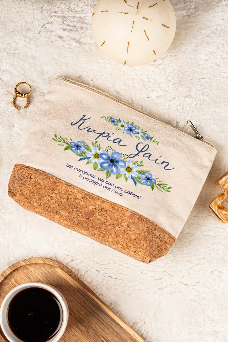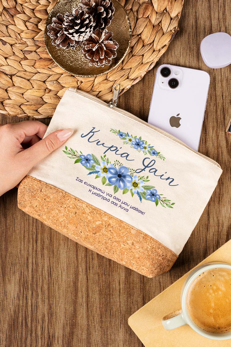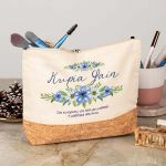 Προσωποποιημένο Εκρού Τσαντάκι & Νεσεσέρ Καλλυντικών με φελλό Μπλε Ανθισμένα Λουλούδια