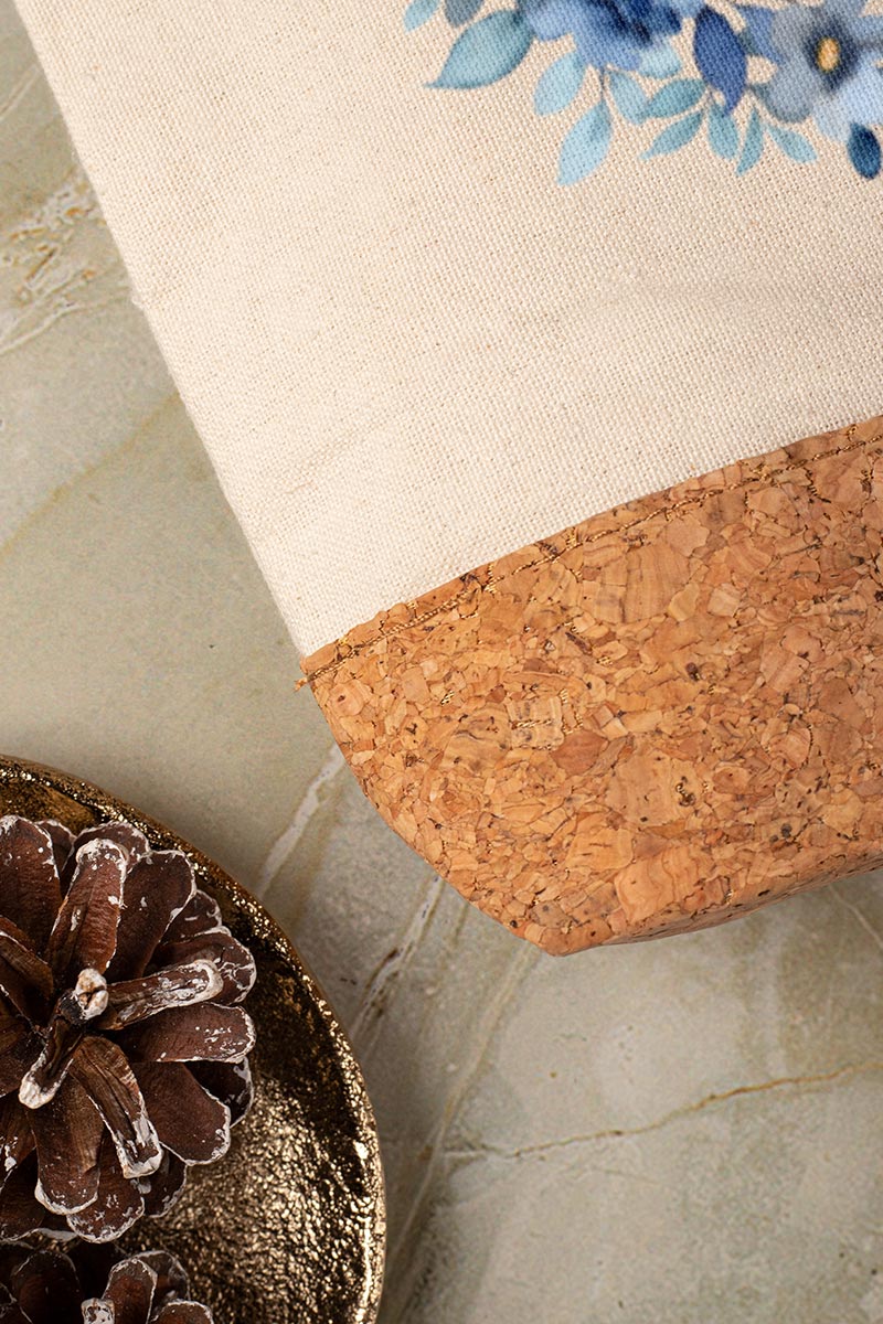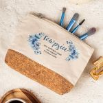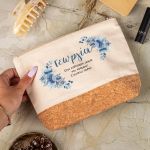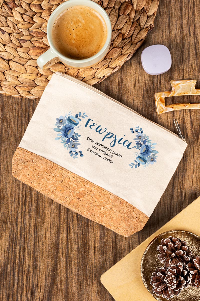 Προσωποποιημένο Εκρού Τσαντάκι & Νεσεσέρ Καλλυντικών με φελλό Μπλε Λουλούδια