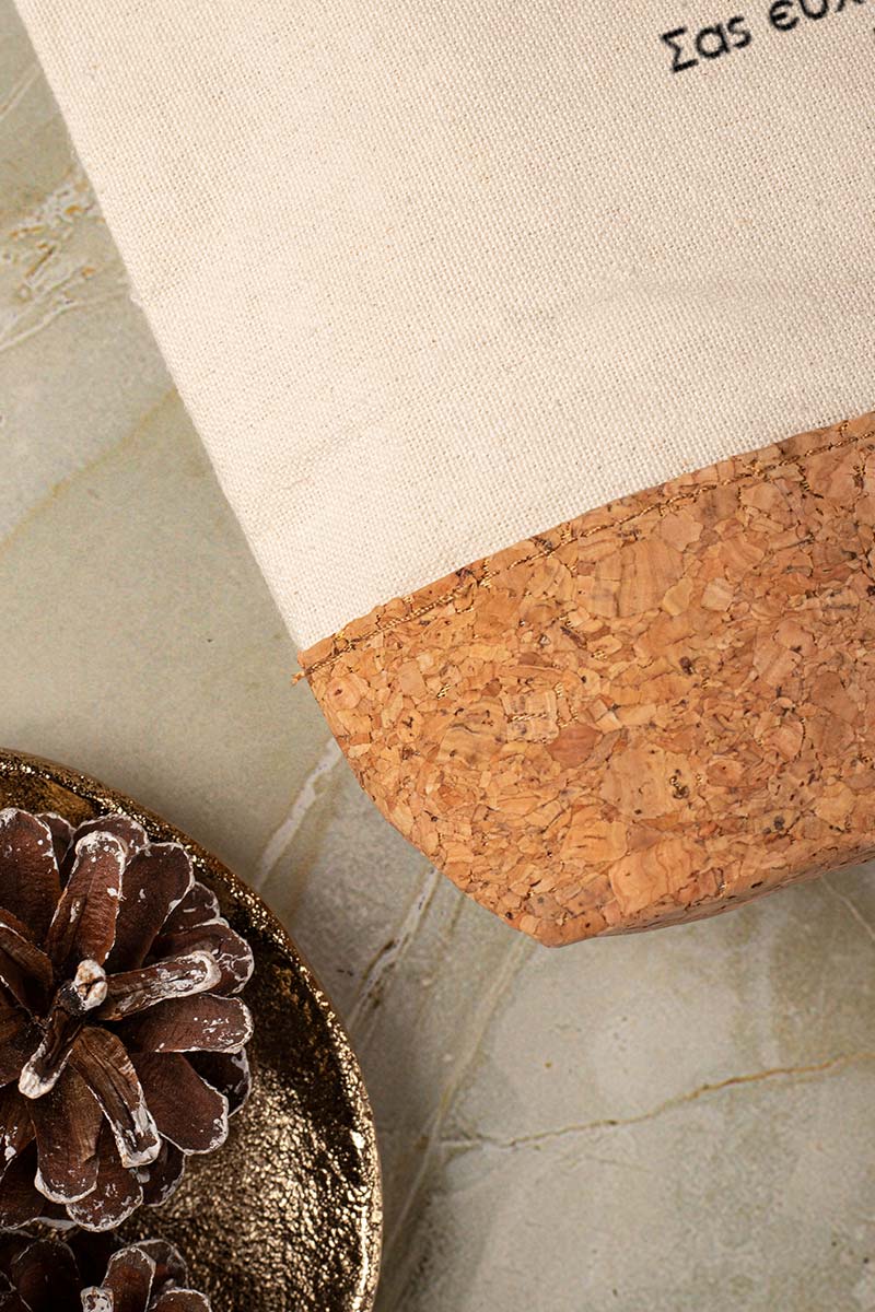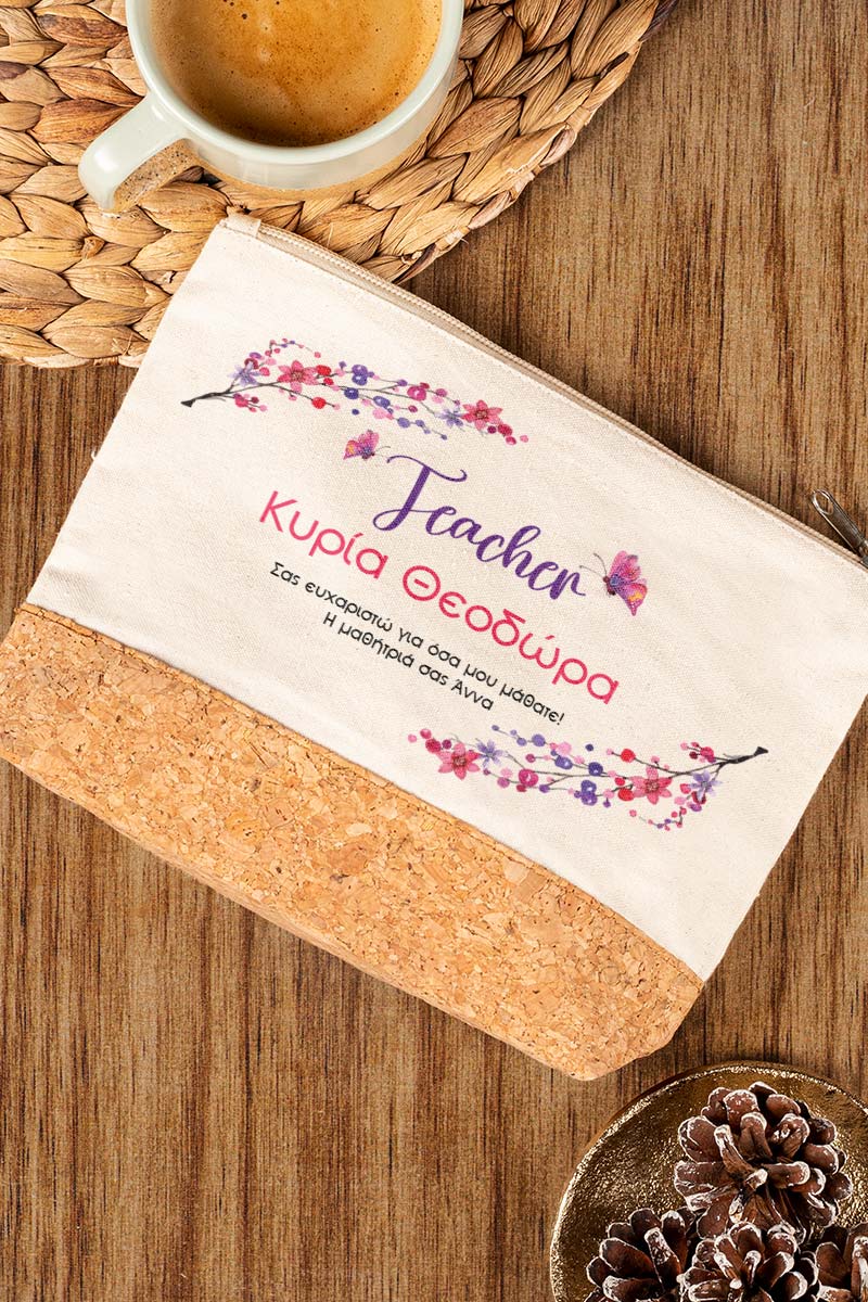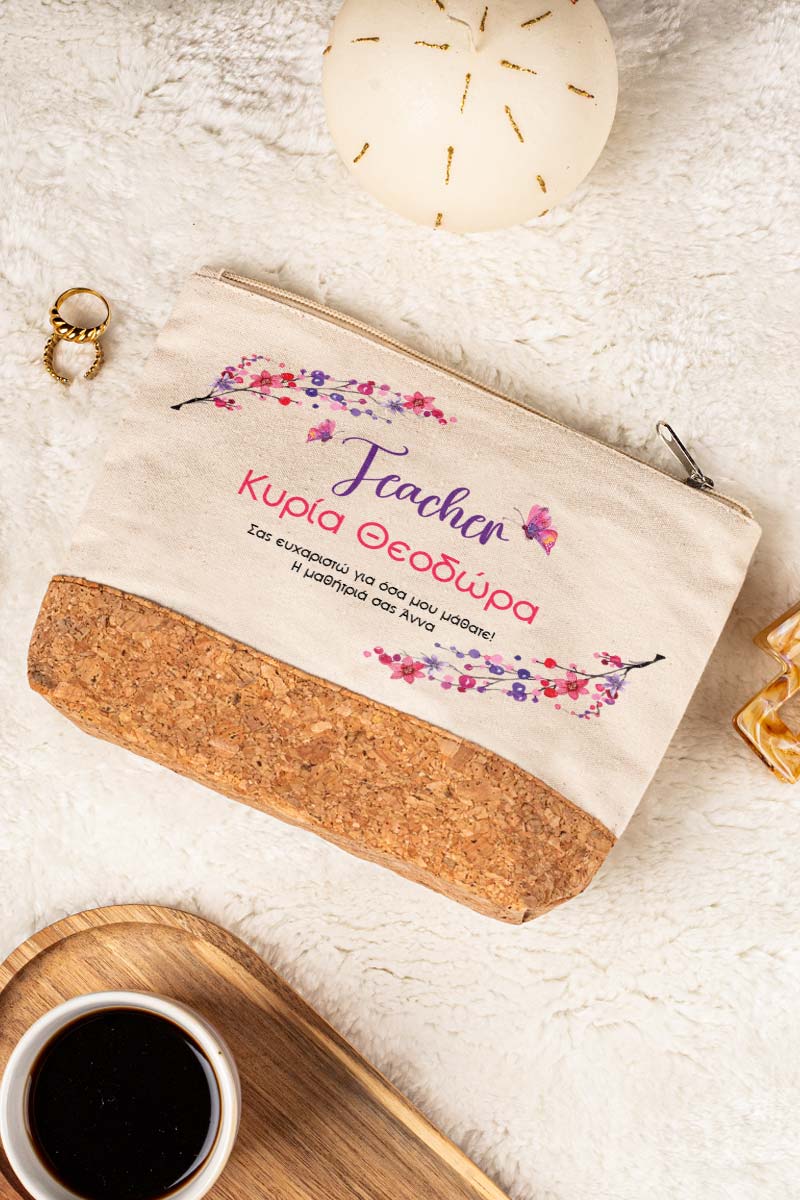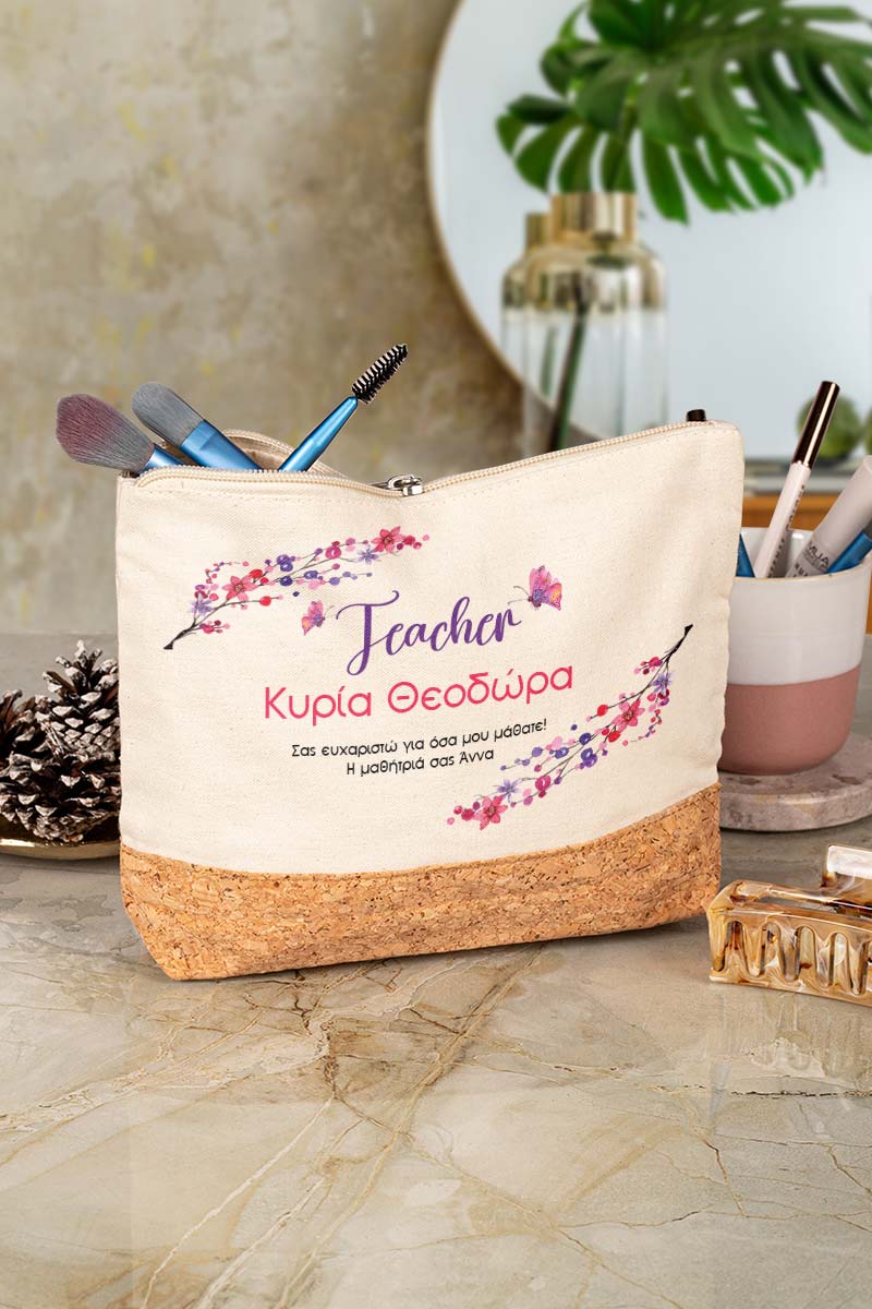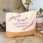 Προσωποποιημένο Εκρού Τσαντάκι & Νεσεσέρ Καλλυντικών με φελλό Ροζ & Μωβ Χρώματα