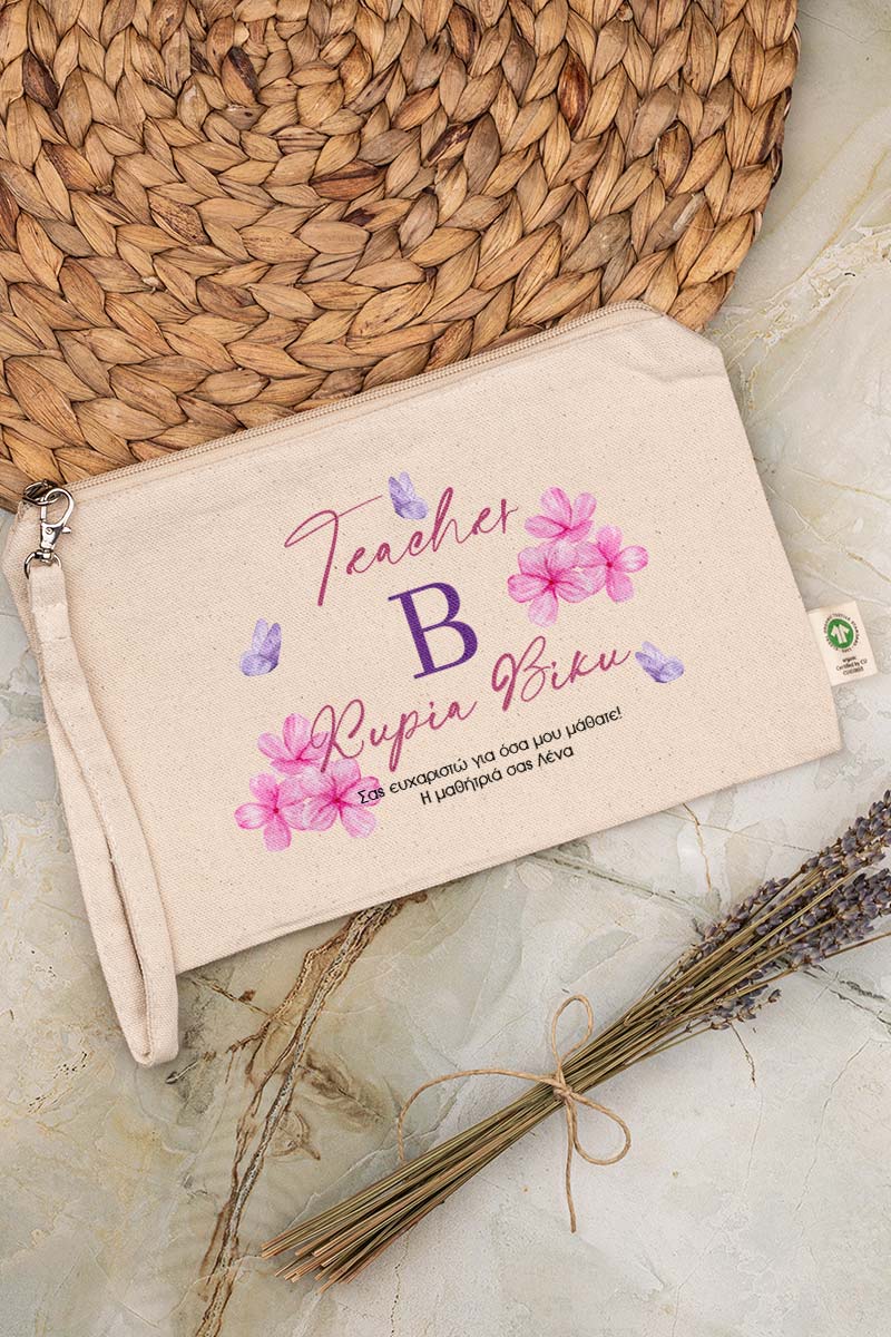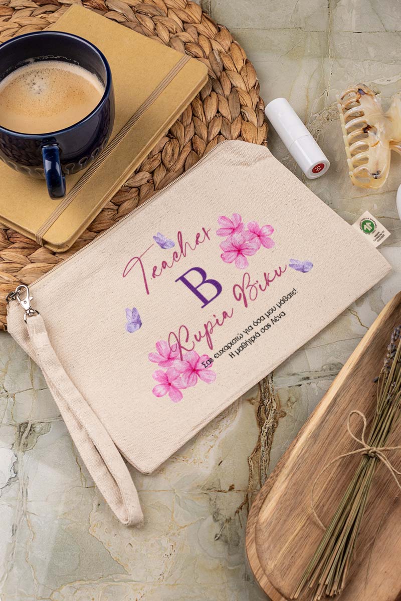 Προσωποποιημένο Εκρού Τσαντάκι & Νεσεσέρ Καλλυντικών Λουλούδια με Πεταλούδες