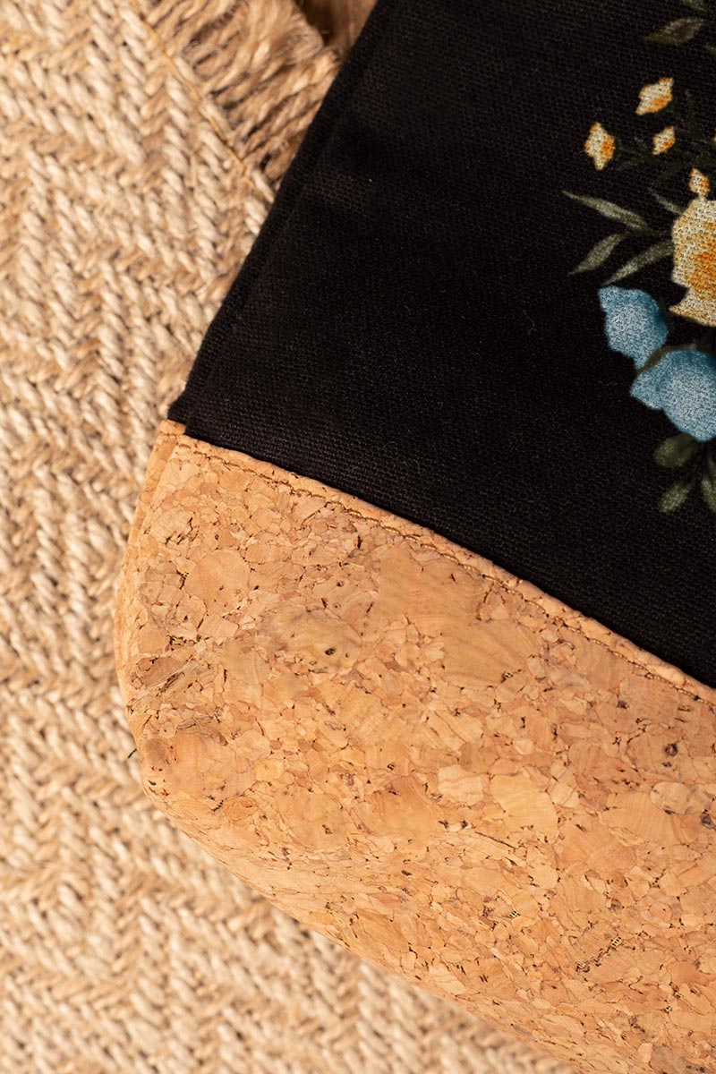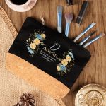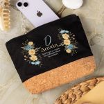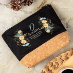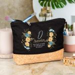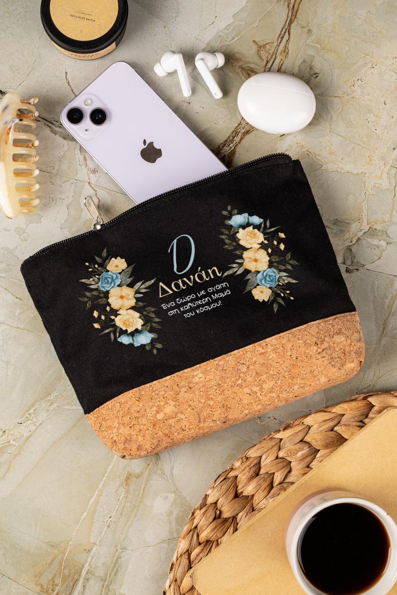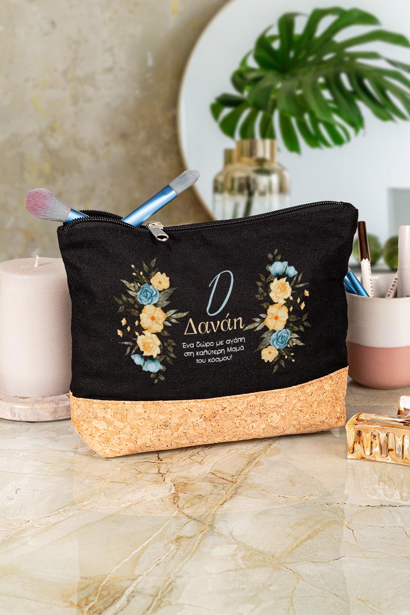 Προσωποποιημένο Μαύρο Τσαντάκι & Νεσεσέρ Καλλυντικών με φελλό Κίτρινα και Μπλε Λουλούδια