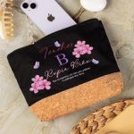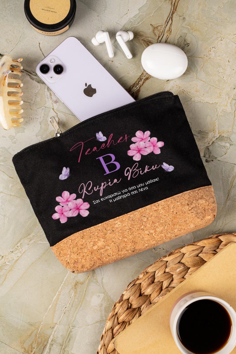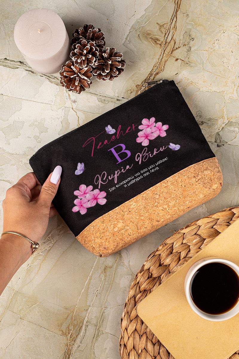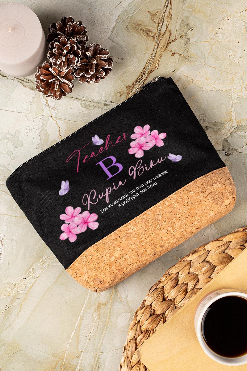 Προσωποποιημένο Μαύρο Τσαντάκι & Νεσεσέρ Καλλυντικών με φελλό Λουλούδια με Πεταλούδες