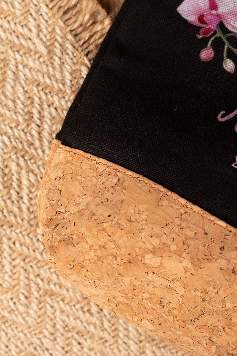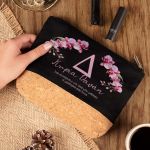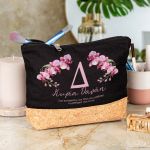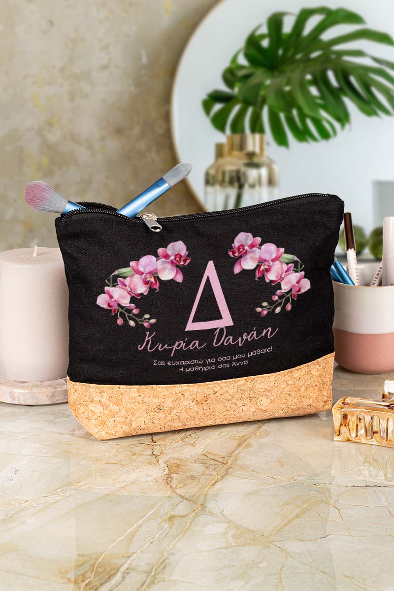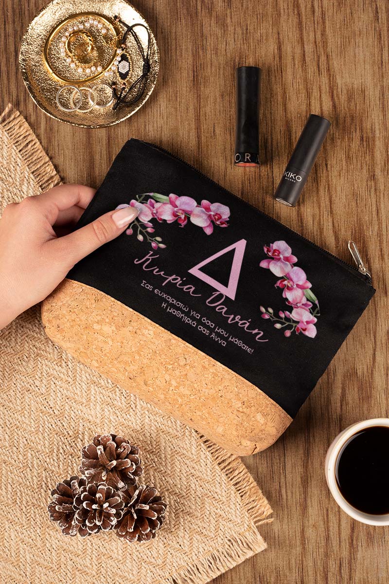 Προσωποποιημένο Μαύρο Τσαντάκι & Νεσεσέρ Καλλυντικών με φελλό Ροζ Ανθισμένα Λουλούδια