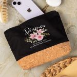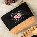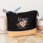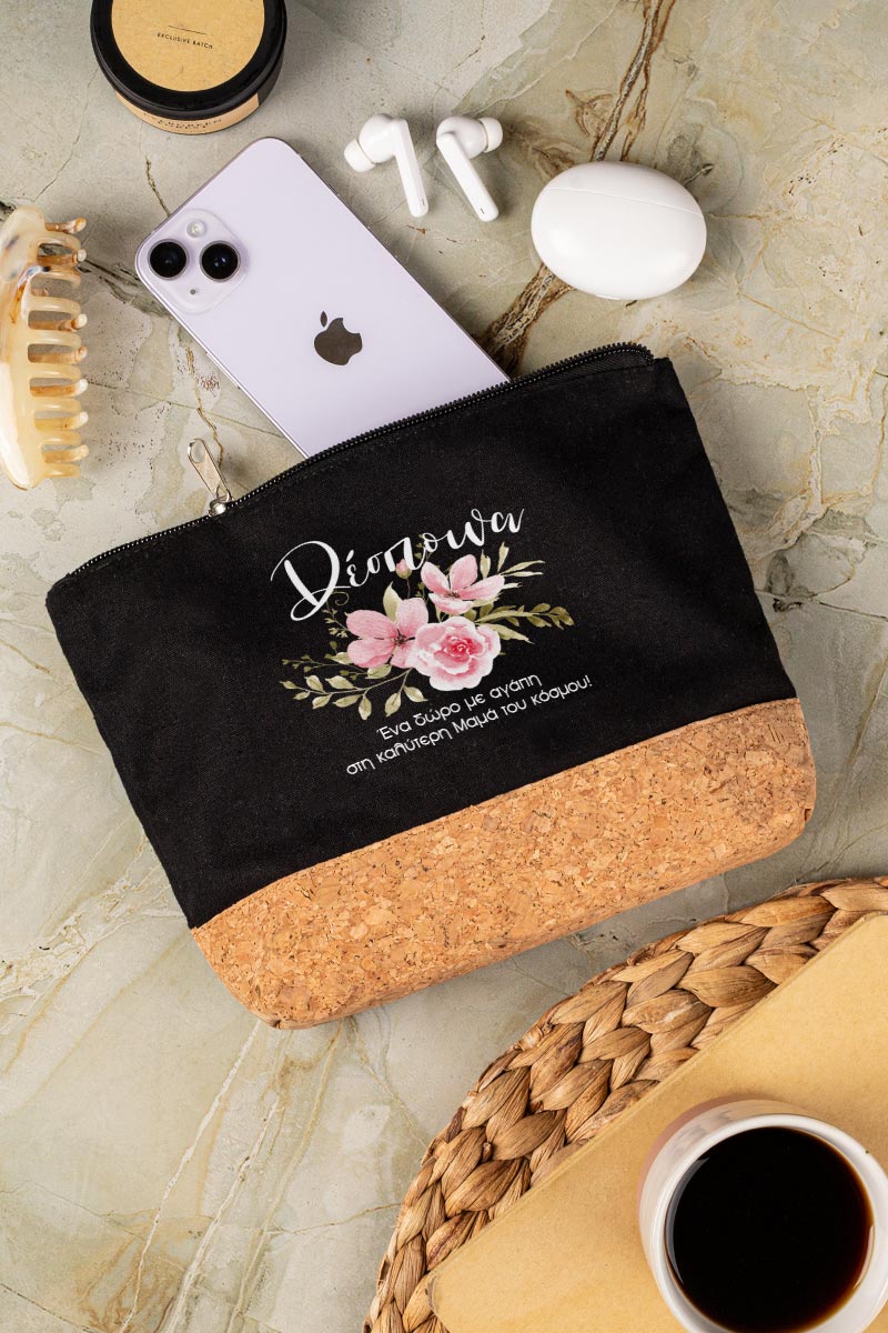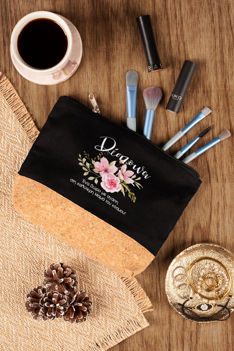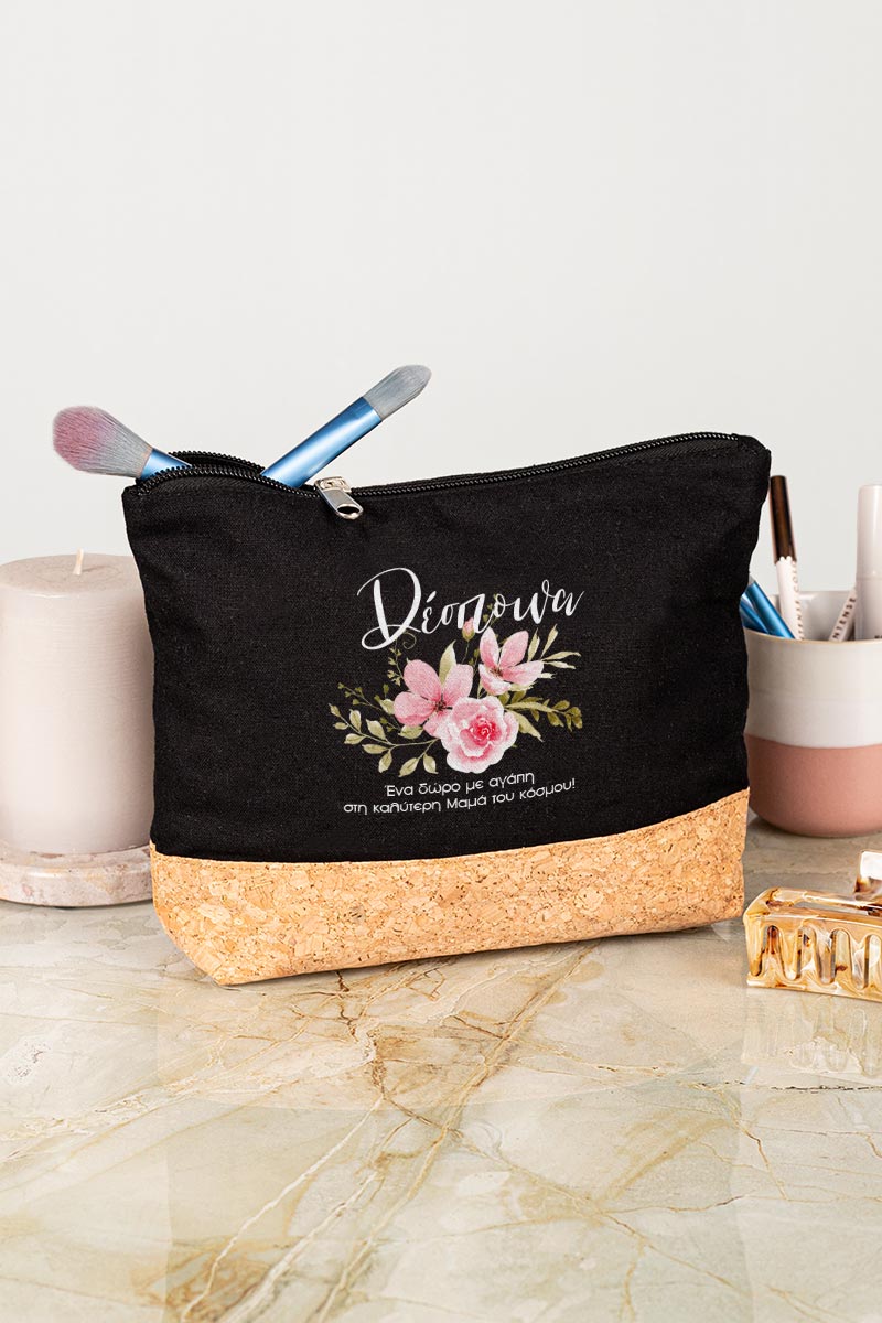 Προσωποποιημένο Μαύρο Τσαντάκι & Νεσεσέρ Καλλυντικών με φελλό Ροζ Κλασσικά Λουλούδια
