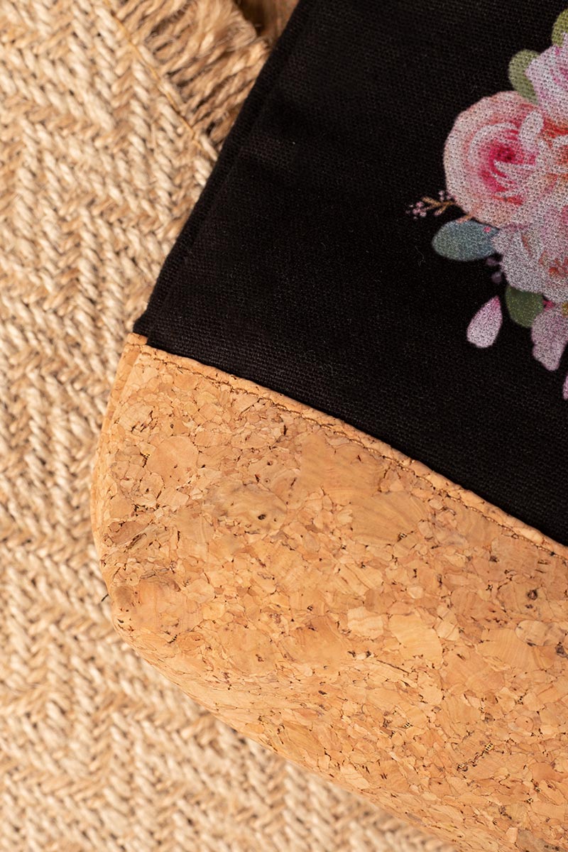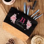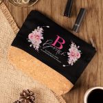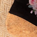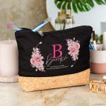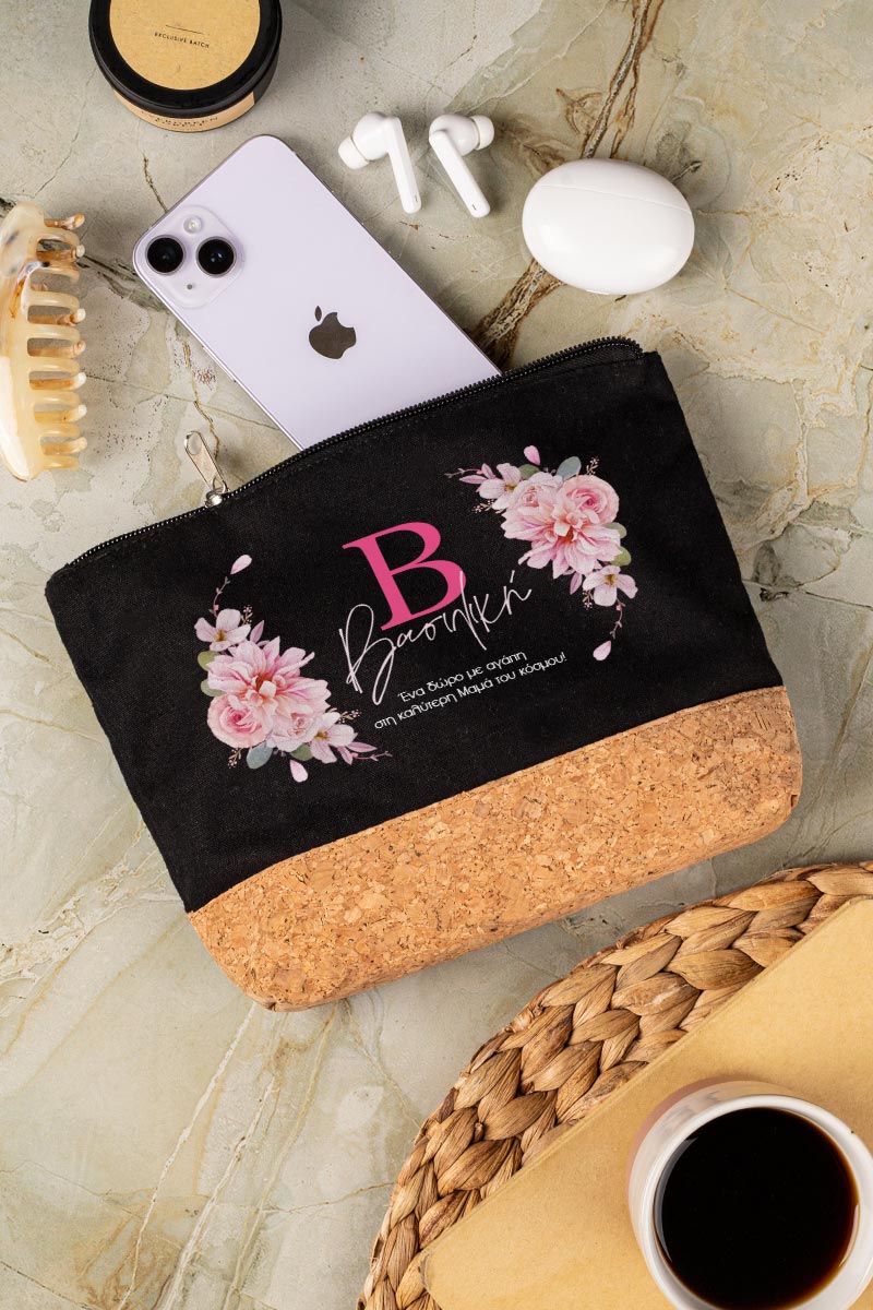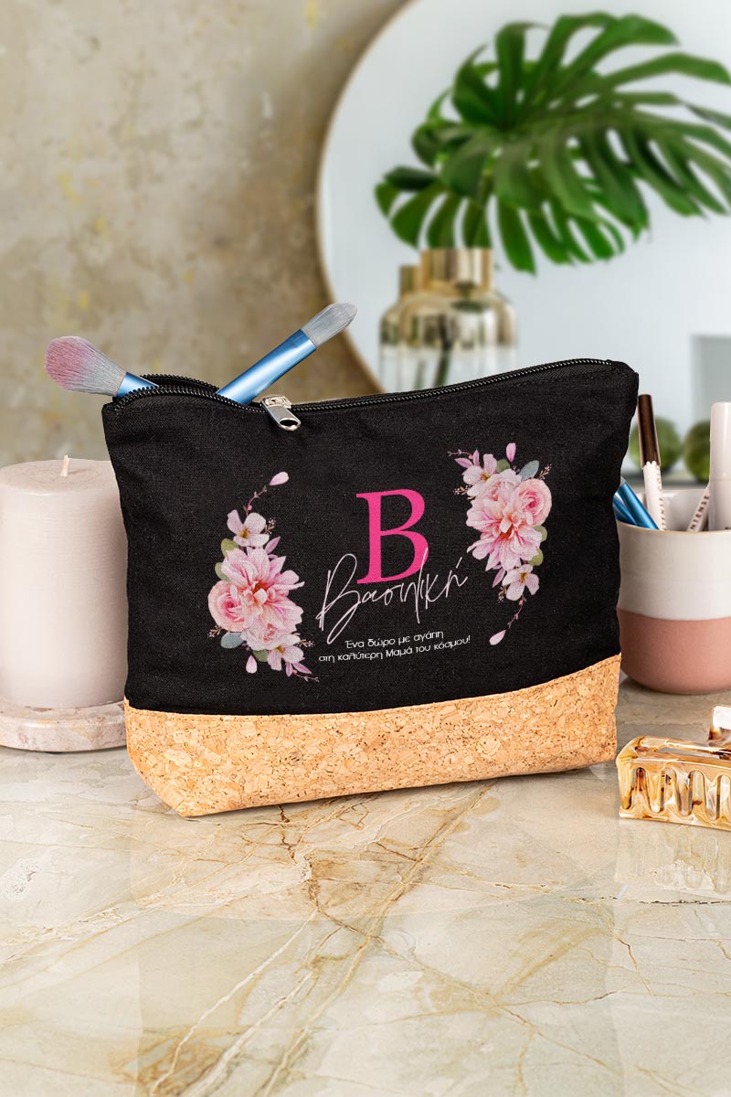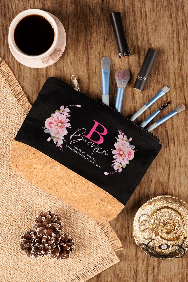 Προσωποποιημένο Μαύρο Τσαντάκι & Νεσεσέρ Καλλυντικών με φελλό Ροζ Λουλούδια