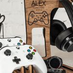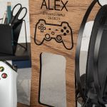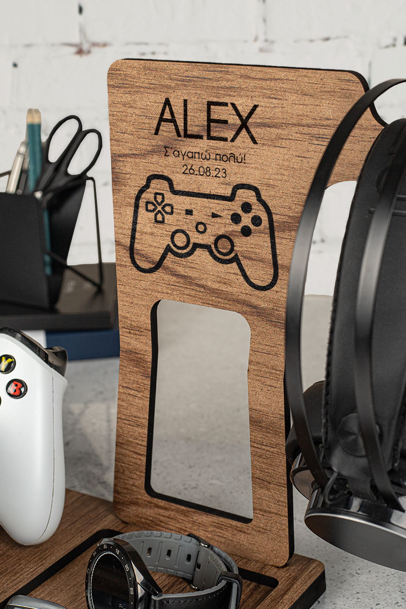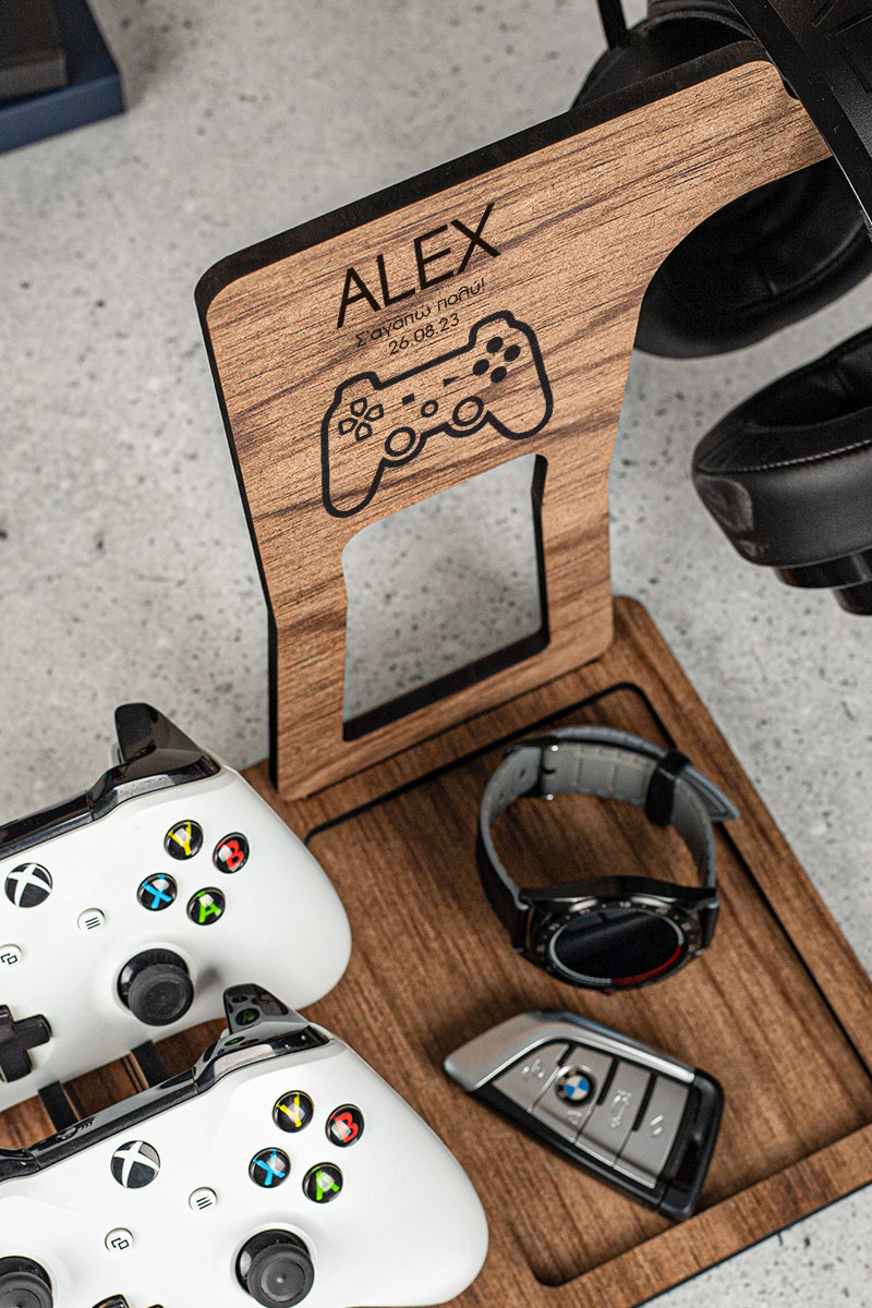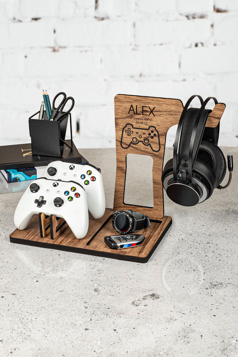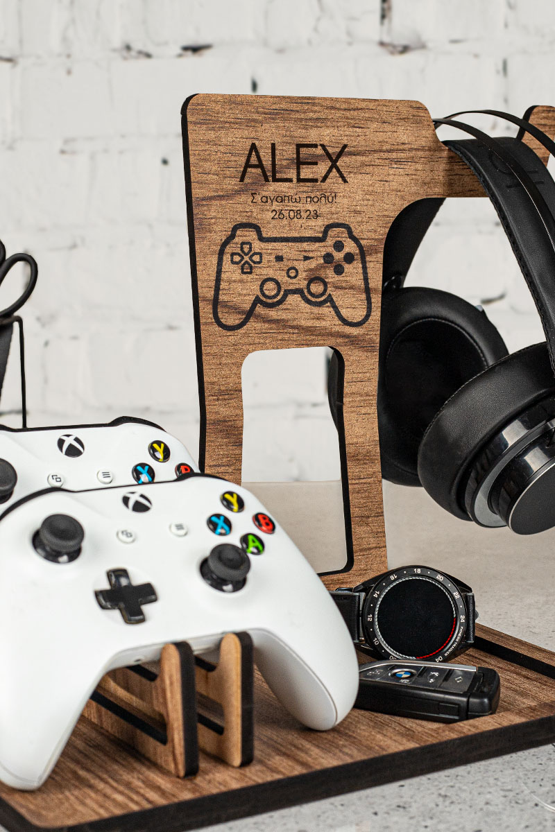 Ξύλινο επιτραπέζιο Stand οργάνωσης για ακουστικά και χειριστήρια