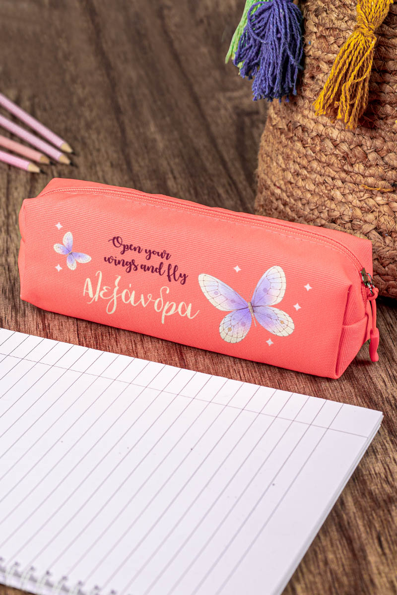 Σχολική Κασετίνα με Όνομα, σε Κοραλί Χρώμα & Σχέδιο Butterflies