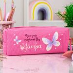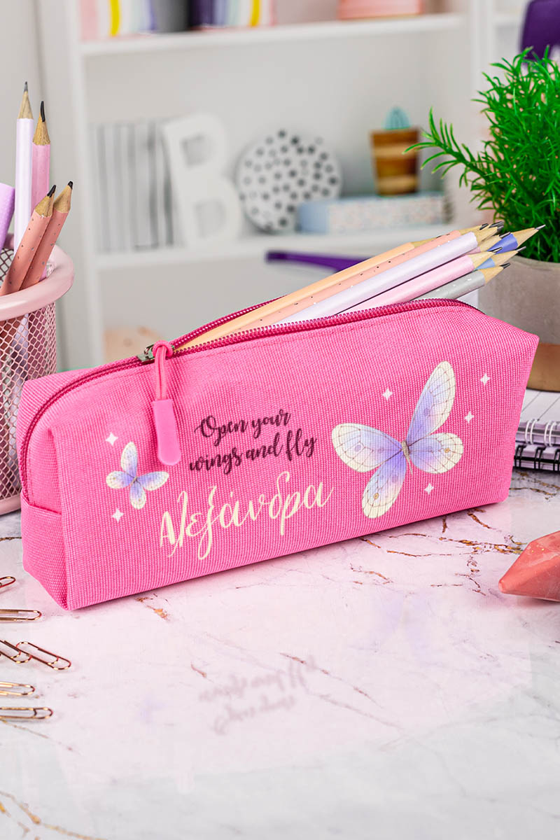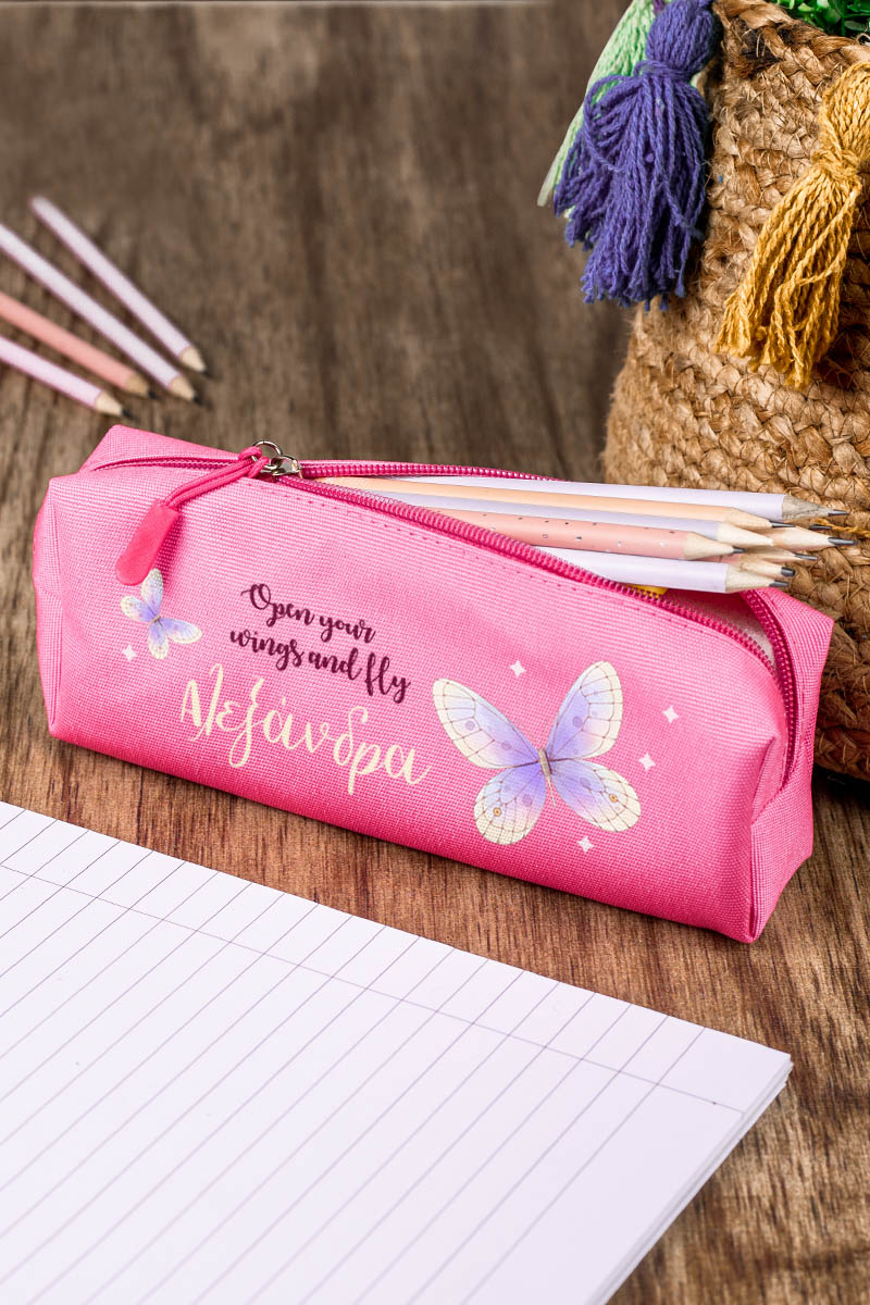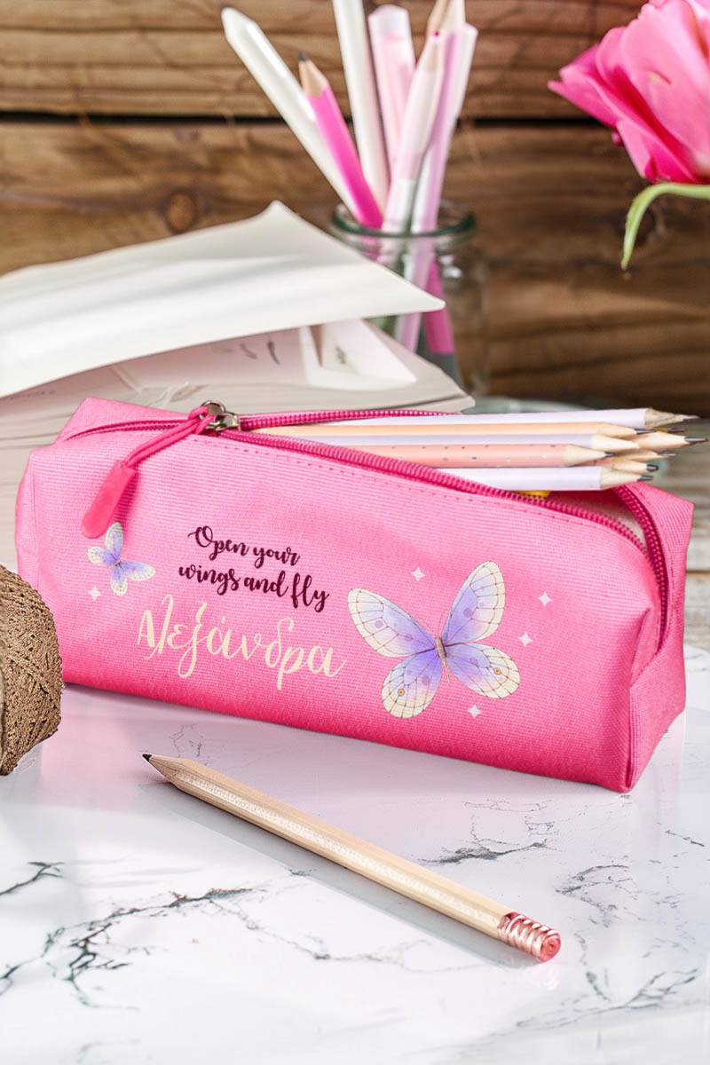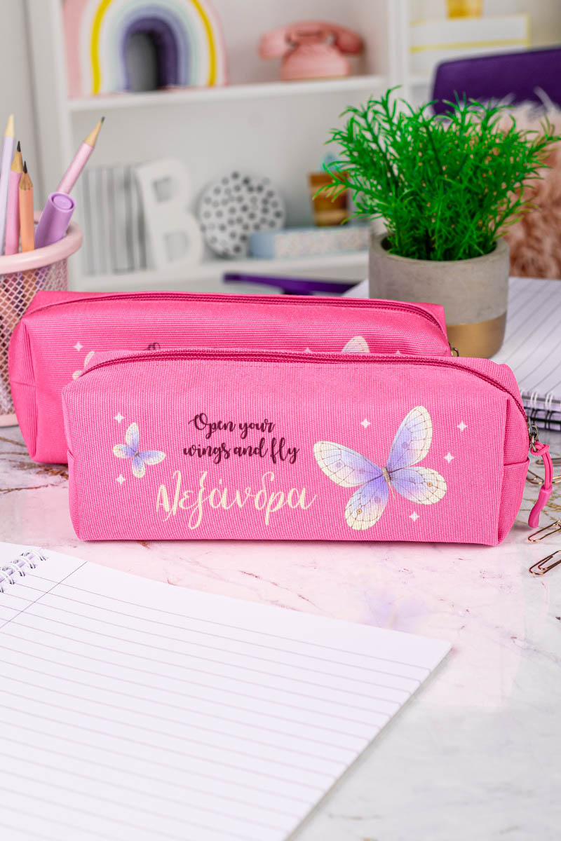 Σχολική Κασετίνα με Όνομα, σε Φούξια Χρώμα & Σχέδιο Butterflies