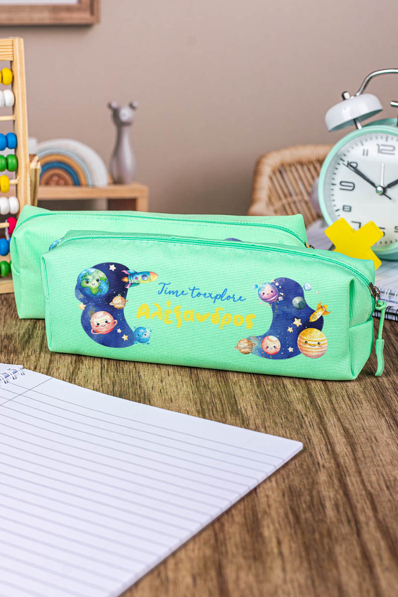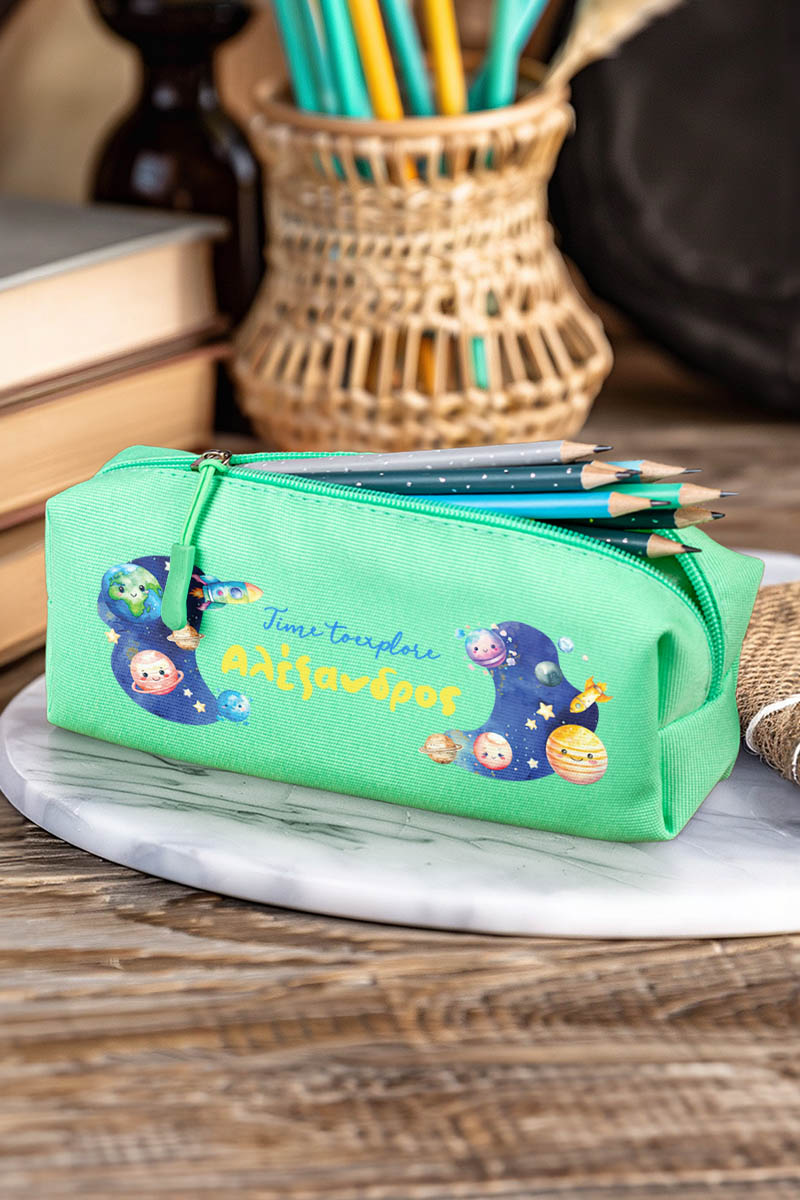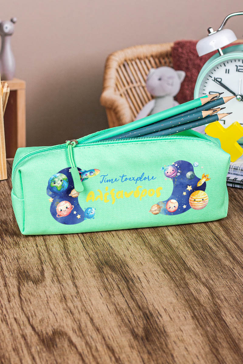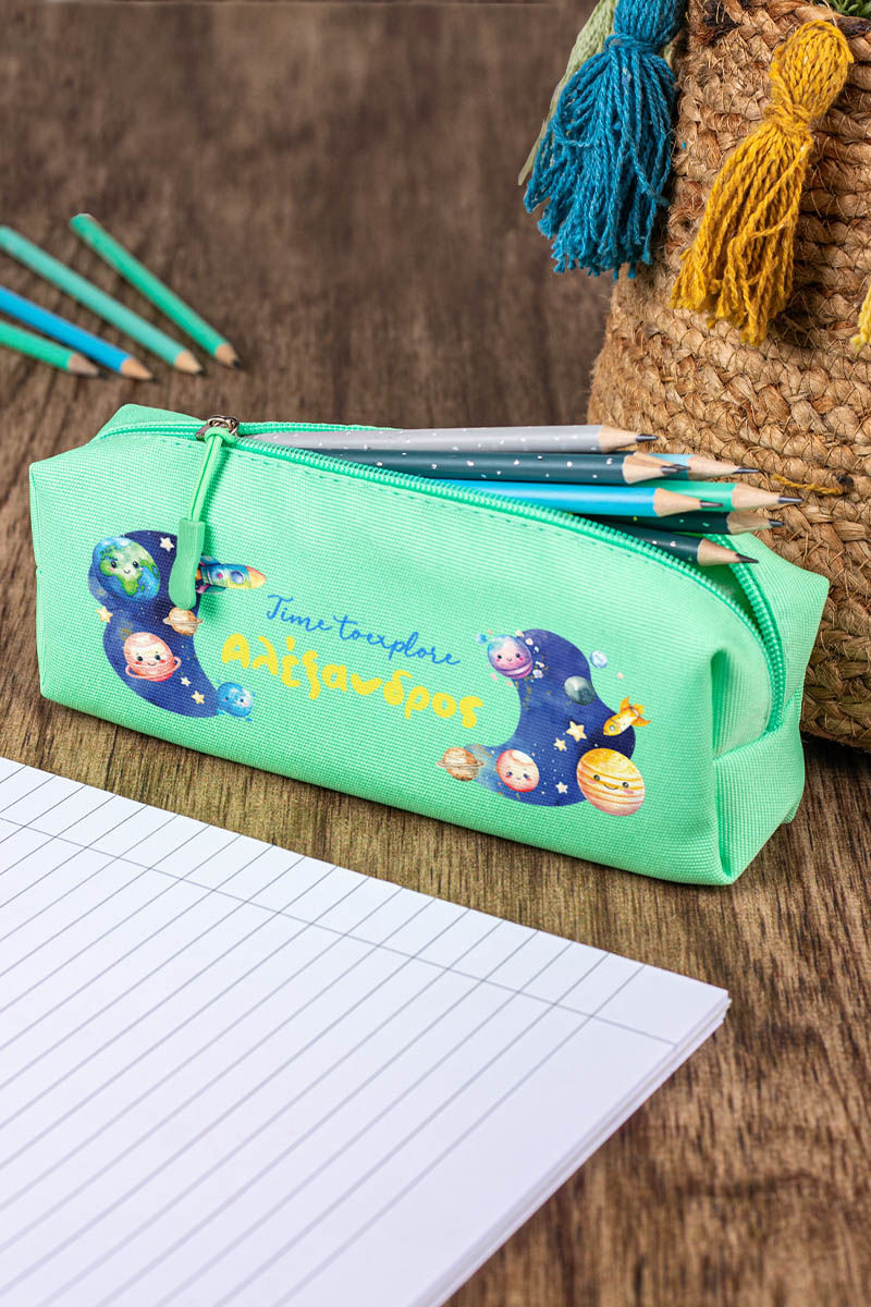 Σχολική Κασετίνα με Όνομα, σε Πετρόλ Χρώμα & Σχέδιο Διάστημα