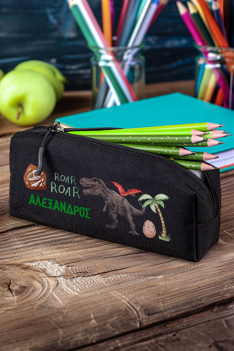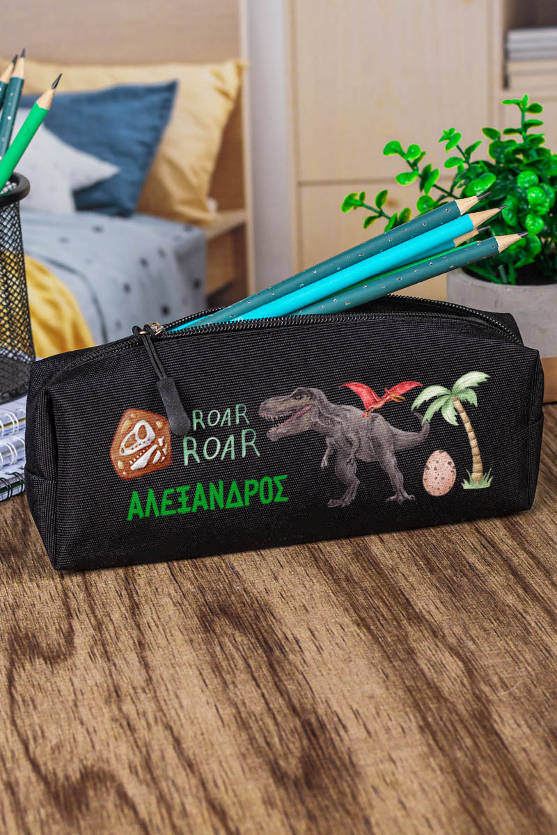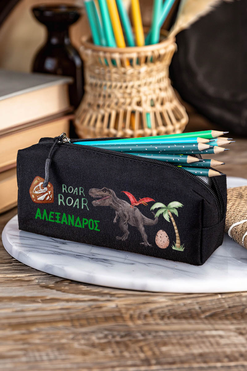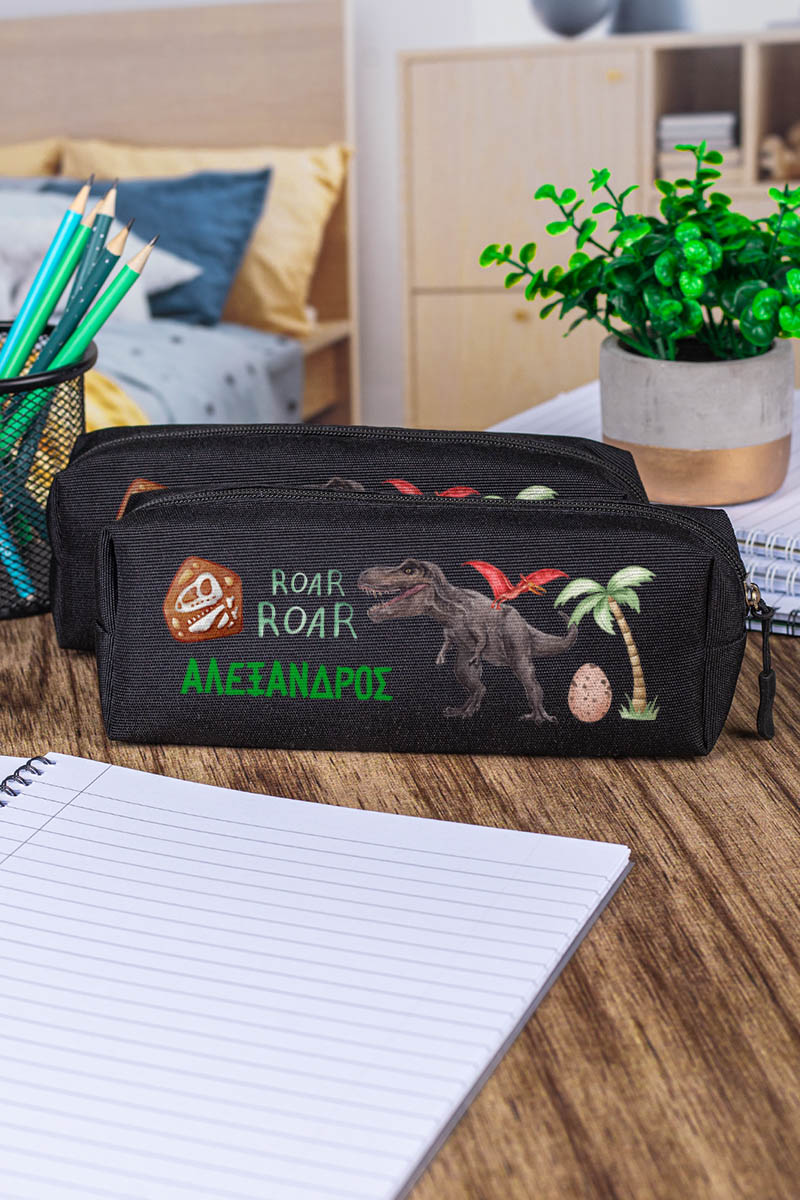 Σχολική Κασετίνα με Όνομα, σε Μαύρο Χρώμα & Σχέδιο Dino