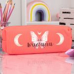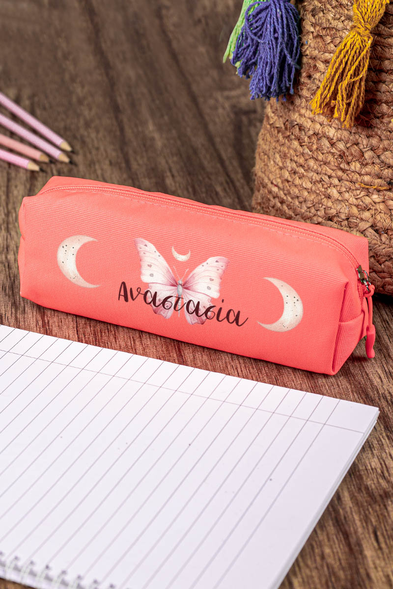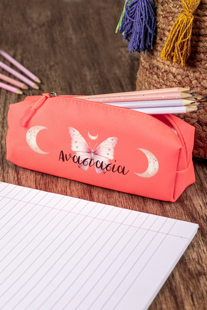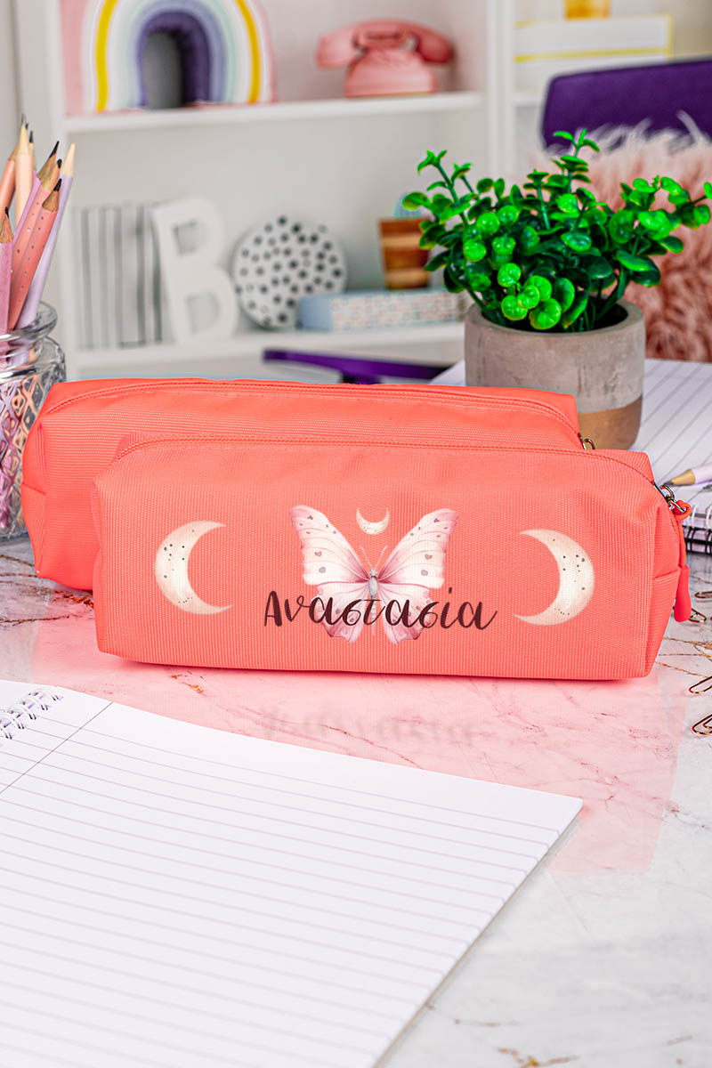 Σχολική Κασετίνα με Όνομα, σε Κοραλί Χρώμα & Σχέδιο Φεγγάρια