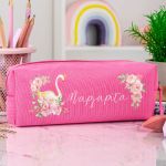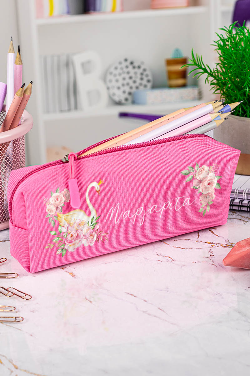 Σχολική Κασετίνα με Όνομα, σε Φούξια Χρώμα & Σχέδιο Κύκνος