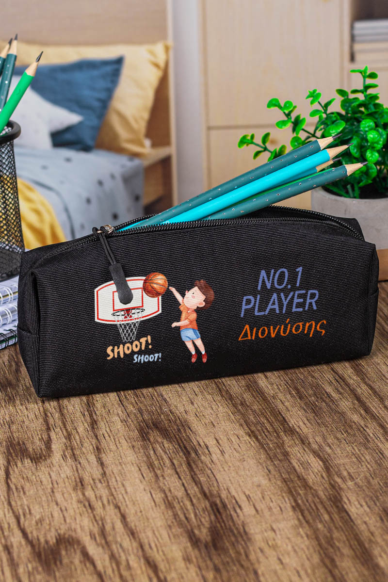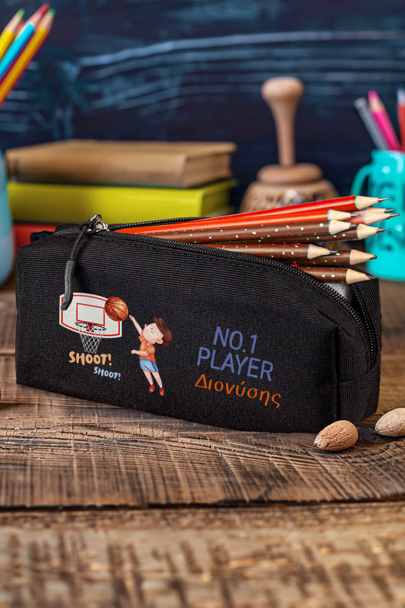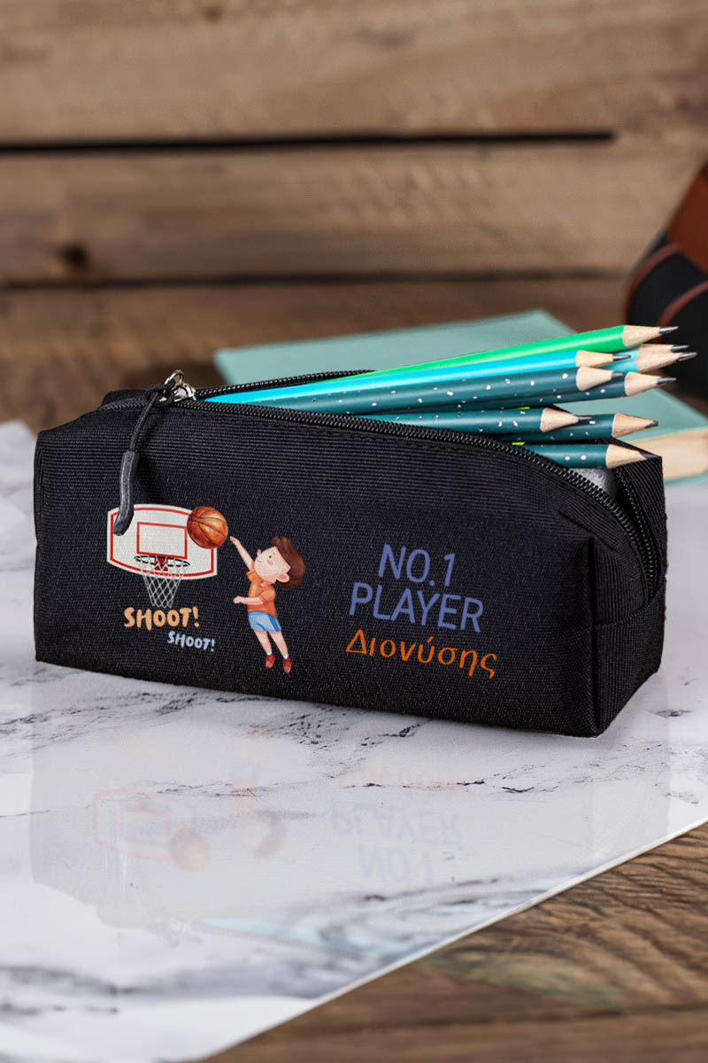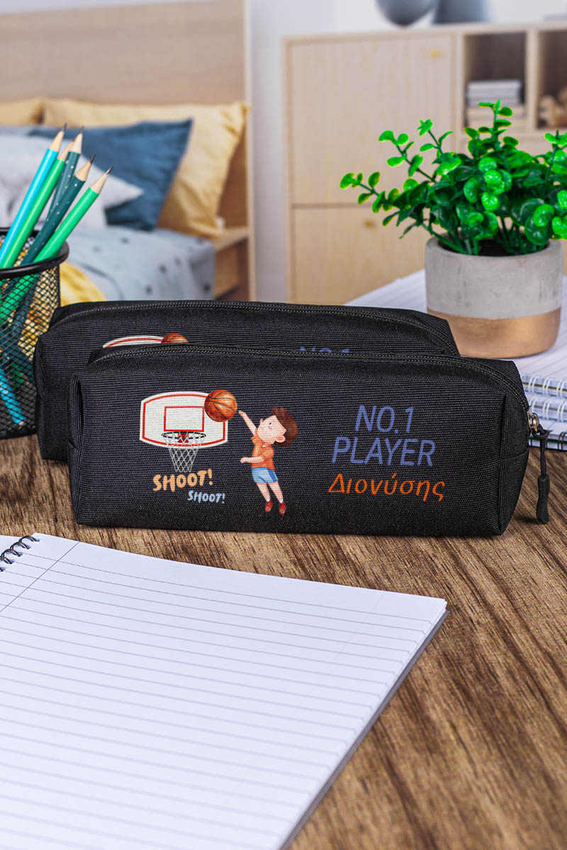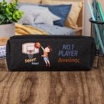 Σχολική Κασετίνα με Όνομα, σε Μαύρο Χρώμα & Σχέδιο Μπάσκετ