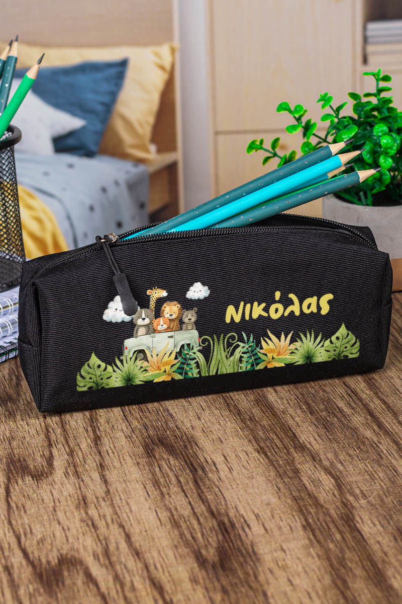 Σχολική Κασετίνα με Όνομα, σε Μαύρο Χρώμα & Σχέδιο Σαφάρι