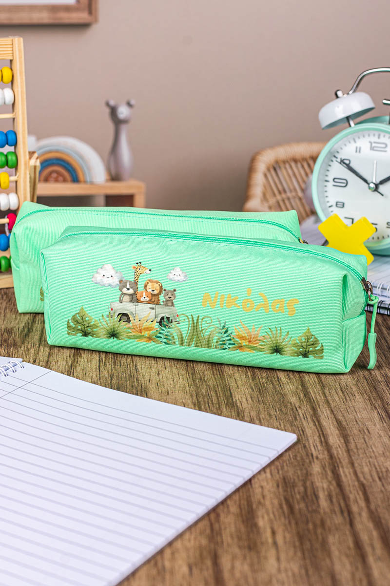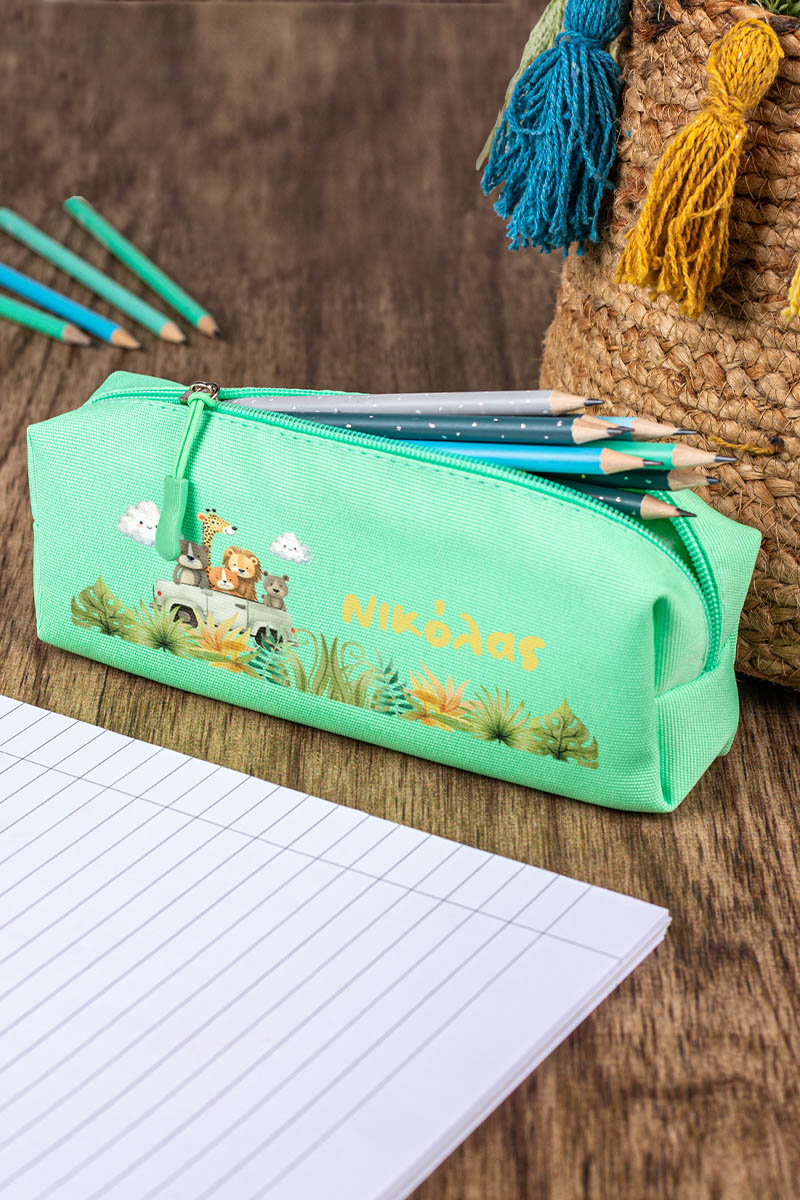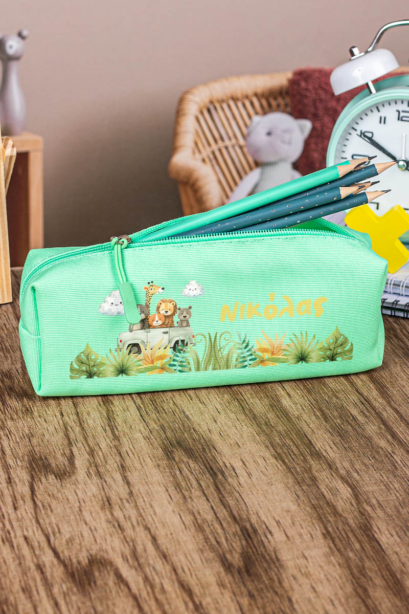 Σχολική Κασετίνα με Όνομα, σε Πετρόλ Χρώμα & Σχέδιο Σαφάρι