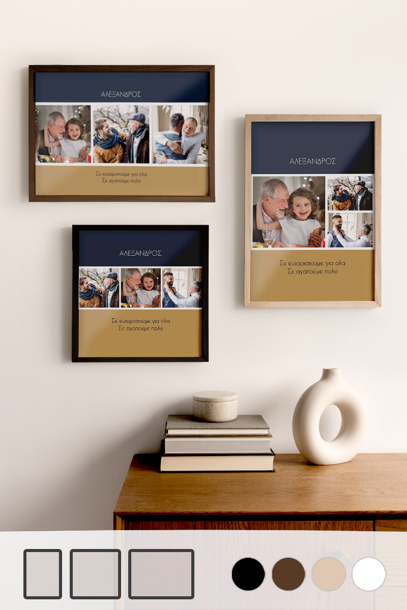 Κάνουμε πιο εύκολο από ποτέ τον τρόπο με τον οποίο μπορείτε να δημιουργήσετε online τα δικά σας έργα τέχνης. Προσθέστε στις κορνίζες σας μονογράμματα, κείμενα, λεζάντες και πολλά άλλα. Σε λίγα λεπτά, μπορείτε να παραγγείλετε ένα έργο τέχνης που θα μετατρέψει έναν συνηθισμένο τοίχο στο σημείο εστίασης οποιουδήποτε δωματίου. Μπορείτε να δημιουργήσετε κορνίζες με τις καθημερινές σας στιγμές, το Γάμο σας, τη Βάπτιση του παιδιού σας, τα ταξίδια σας, τις διακοπές σας, τις σημαντικές στιγμές σας και πολλά άλλα.