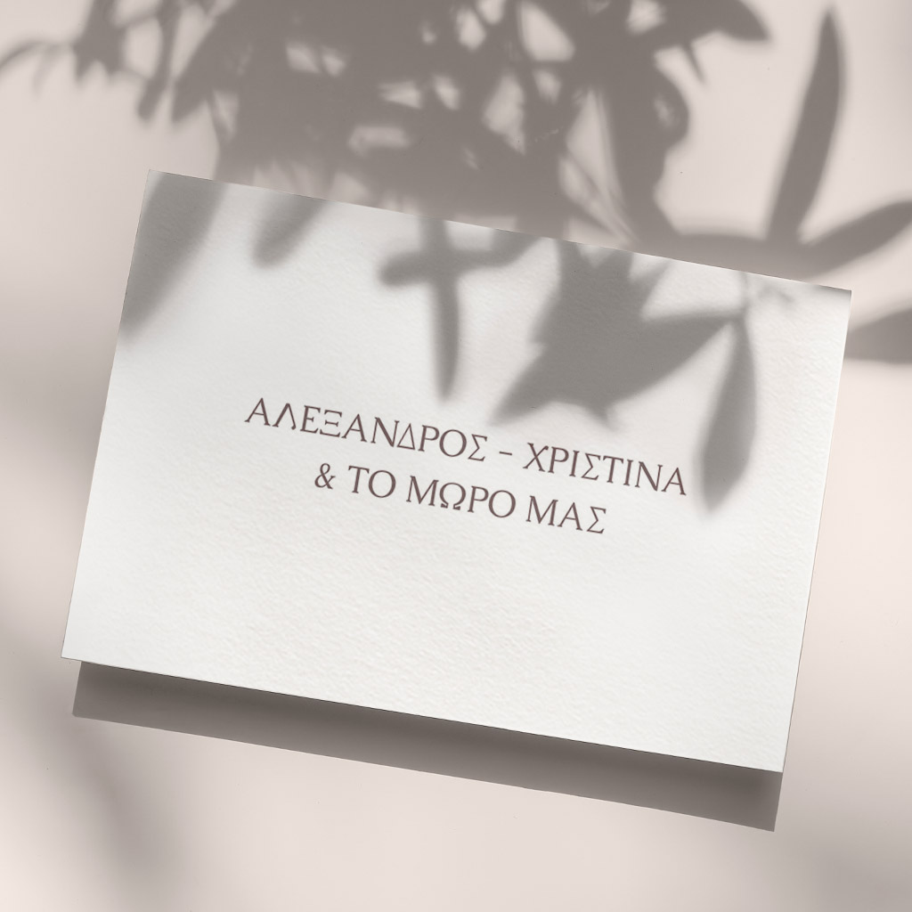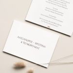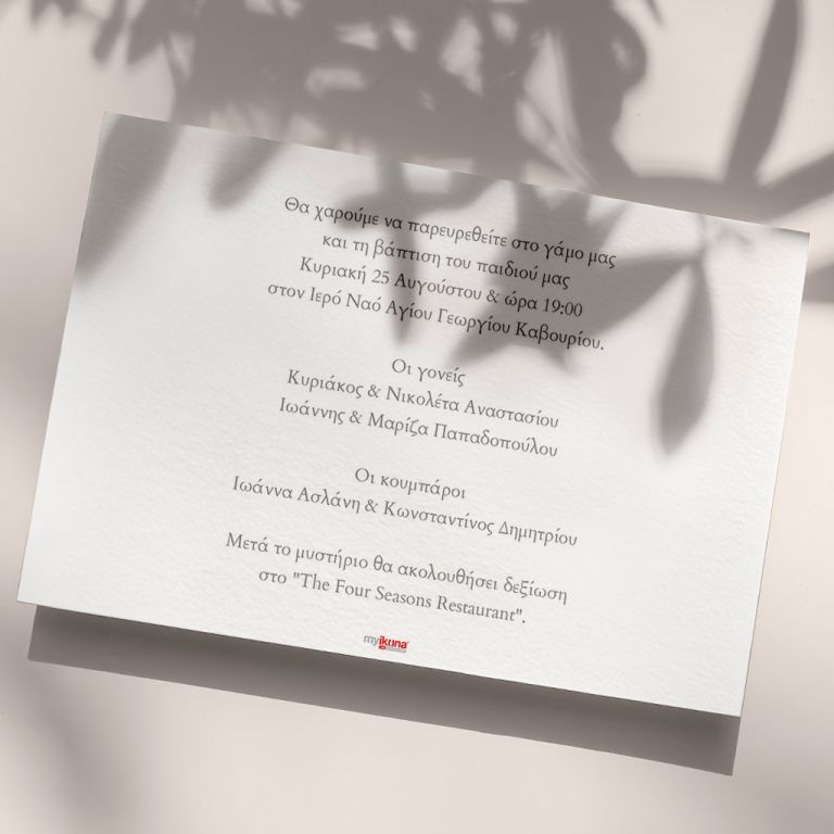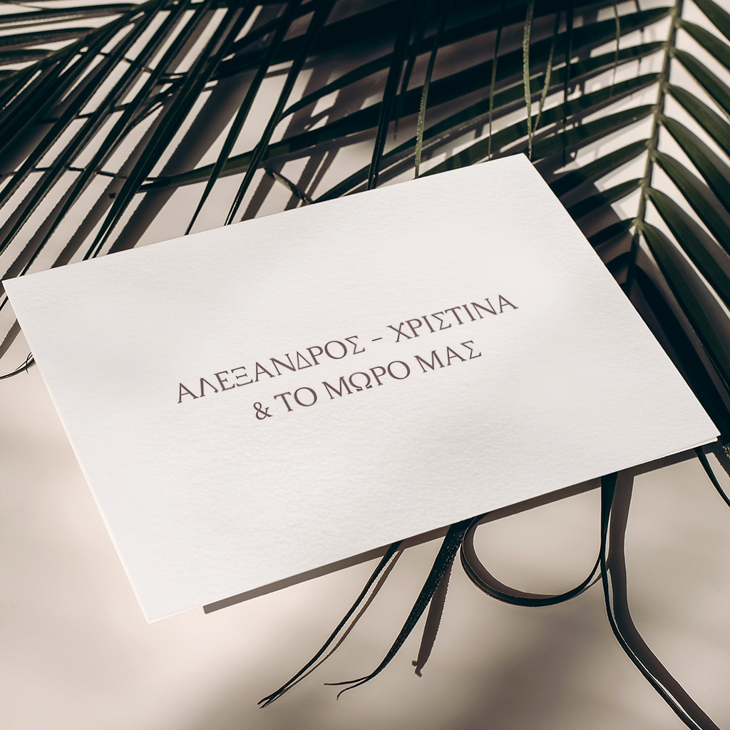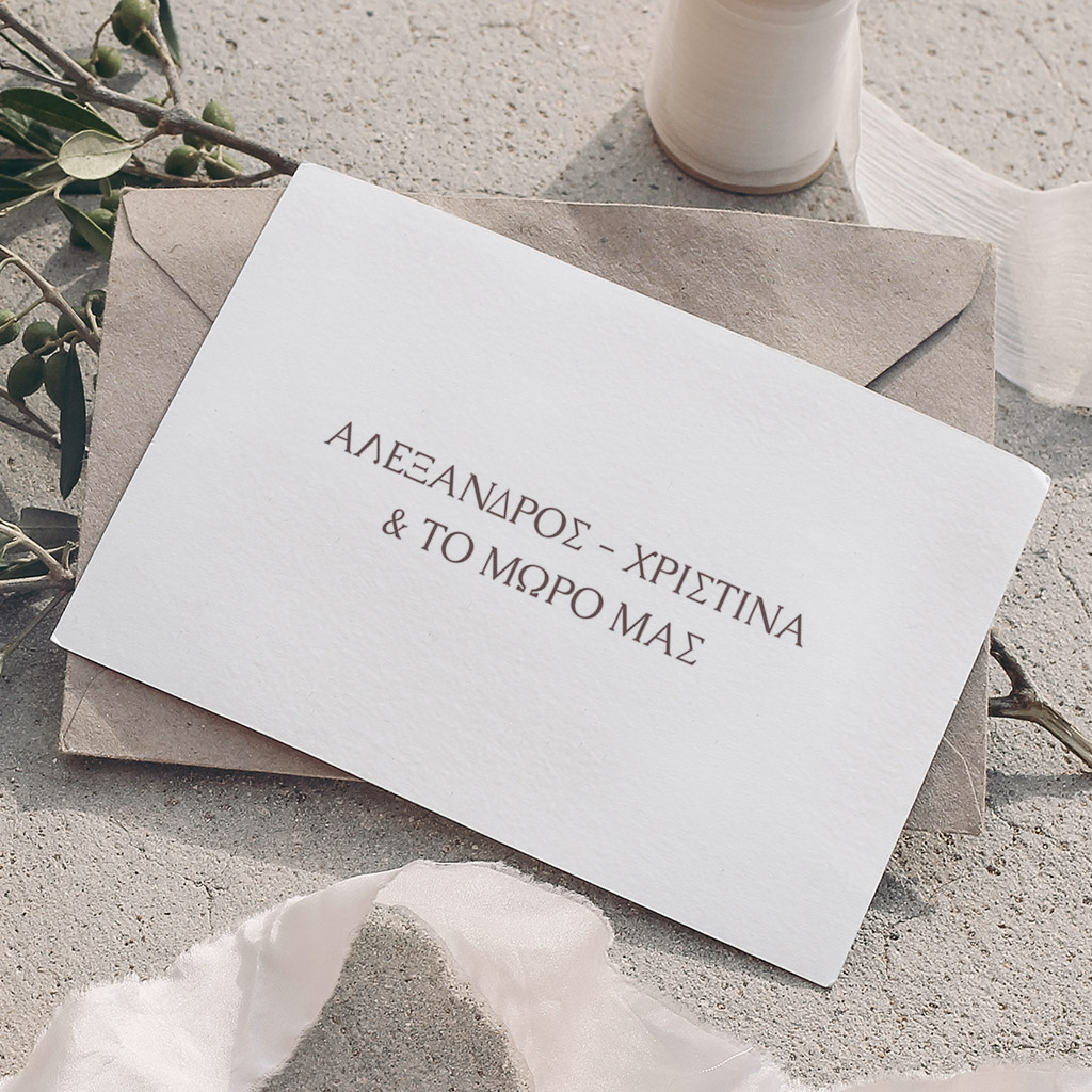 Αποκτήστε τα προσκλητήρια γάμου με σχέδιο Minimal Elegance. Οι πελάτες μας τα ξεχωρίζουν για το υψηλής ποιότητας ιταλικό χαρτί και την εκτύπωση υψηλής ευκρίνειας Myikona High Definition. Διαθέσιμα σε διαφορετικές διαστάσεις.