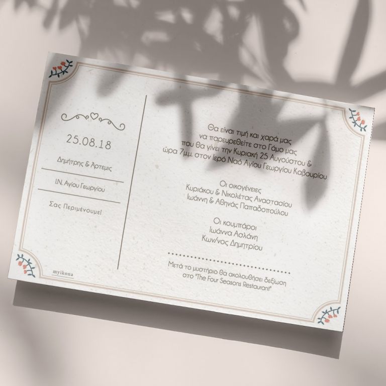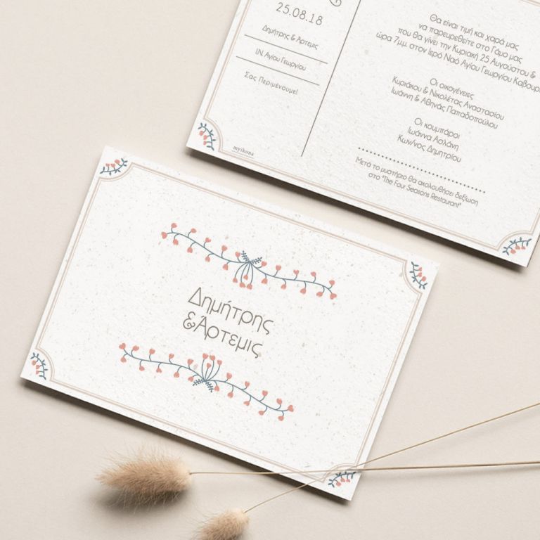 Αποκτήστε τα προσκλητήρια γάμου με σχέδιο Minimal Ανθισμένα Λουλούδια. Οι πελάτες μας τα ξεχωρίζουν για το υψηλής ποιότητας ιταλικό χαρτί και την εκτύπωση υψηλής ευκρίνειας Myikona High Definition. Διαθέσιμα σε διαφορετικές διαστάσεις.
