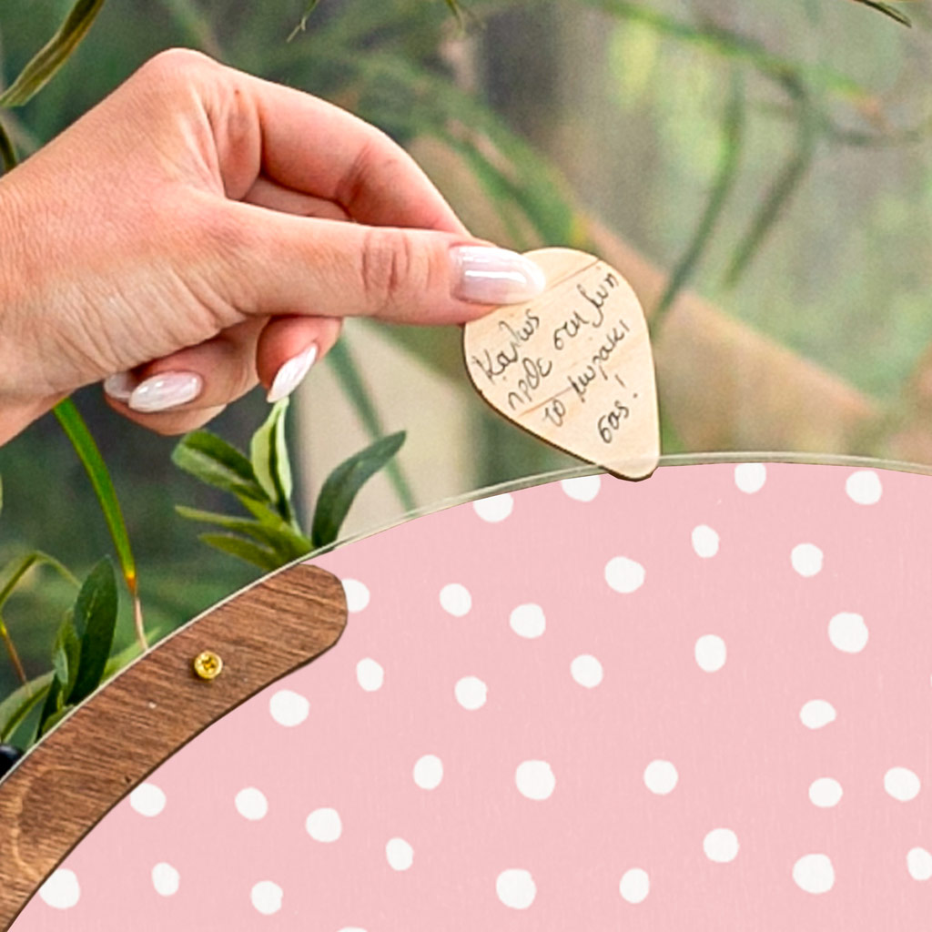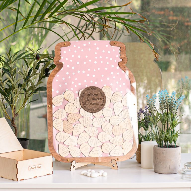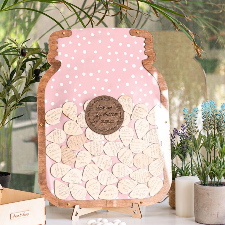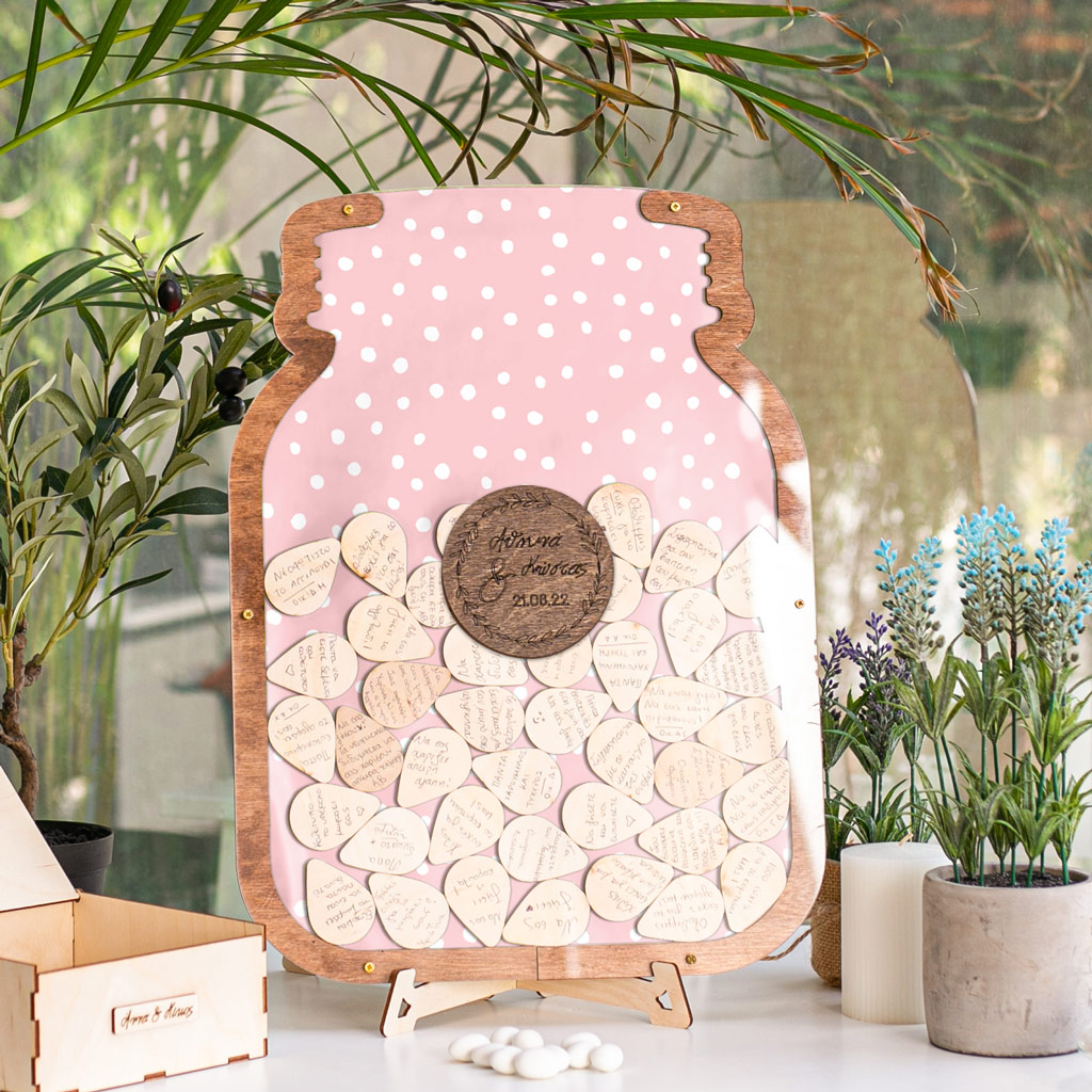 Κρατήστε τις ευχές των αγαπημένων σας με τον πιο πρωτότυπο τρόπο. Η ξύλινη κατασκευή λειτουργεί όπως ένας <<κουμπαράς>>. Προσωποποιήστε το ευχολόγιο με το ονόματά σας & την ημερομηνία του μυστηρίου.