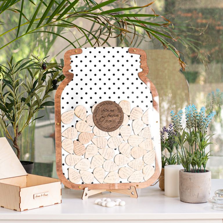 Κρατήστε τις ευχές των αγαπημένων σας με τον πιο πρωτότυπο τρόπο. Η ξύλινη κατασκευή λειτουργεί όπως ένας <<κουμπαράς>>. Προσωποποιήστε το ευχολόγιο με το ονόματά σας & την ημερομηνία του μυστηρίου.
