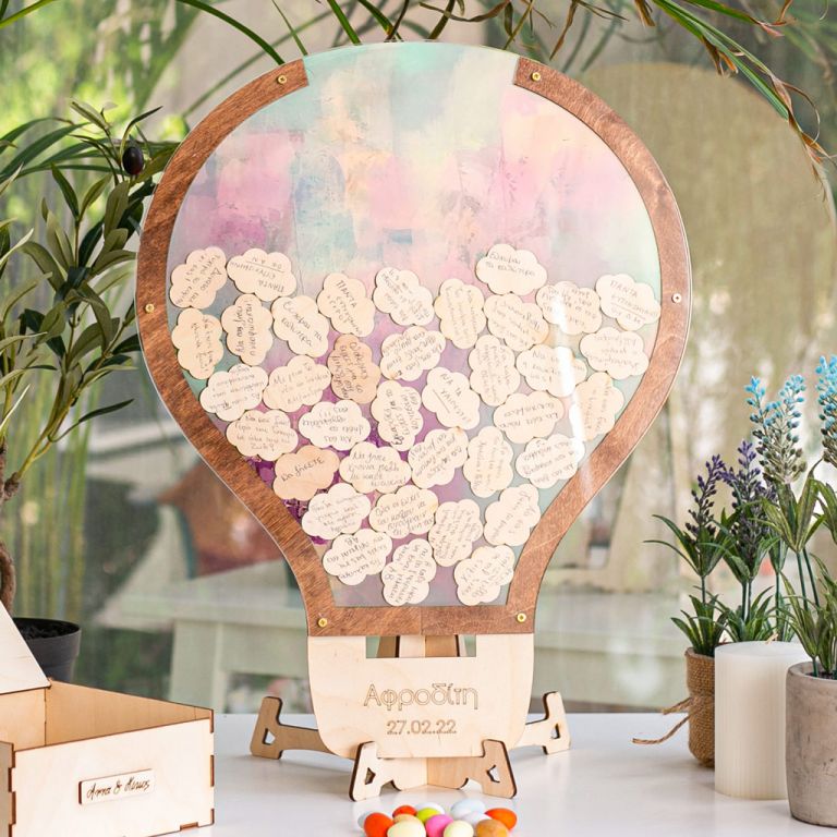 Κρατήστε τις ευχές των αγαπημένων σας με τον πιο πρωτότυπο τρόπο. Η ξύλινη κατασκευή λειτουργεί όπως ένας <<κουμπαράς>>. Προσωποποιήστε το ευχολόγιο βάπτισης με το όνομα του παιδιού και την ημερομηνία του μυστηρίου.