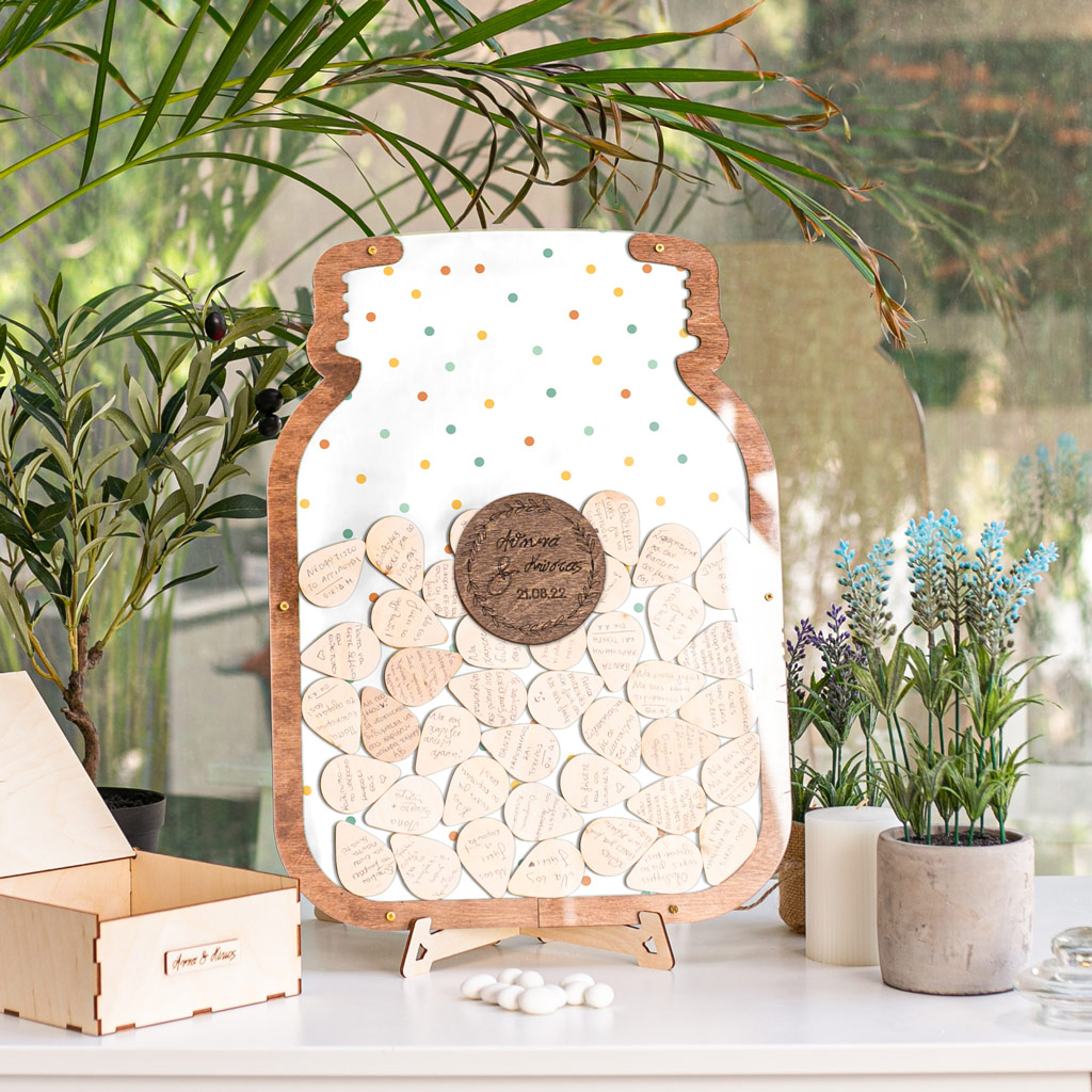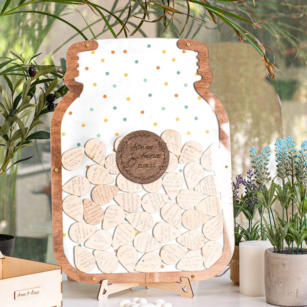 Κρατήστε τις ευχές των αγαπημένων σας με τον πιο πρωτότυπο τρόπο. Η ξύλινη κατασκευή λειτουργεί όπως ένας <<κουμπαράς>>. Προσωποποιήστε το ευχολόγιο με το ονόματά σας & την ημερομηνία του μυστηρίου.