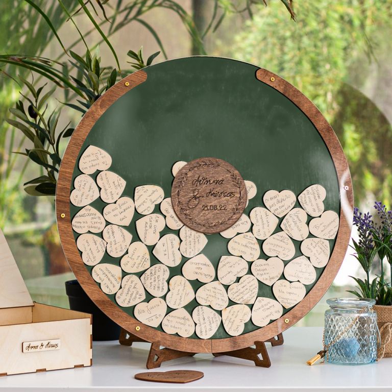 Κρατήστε τις ευχές των αγαπημένων σας με τον πιο πρωτότυπο τρόπο. Η ξύλινη κατασκευή λειτουργεί όπως ένας <<κουμπαράς>>. Προσωποποιήστε το ευχολόγιο με το ονόματά σας & την ημερομηνία του μυστηρίου.