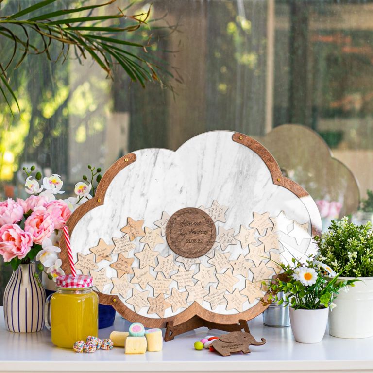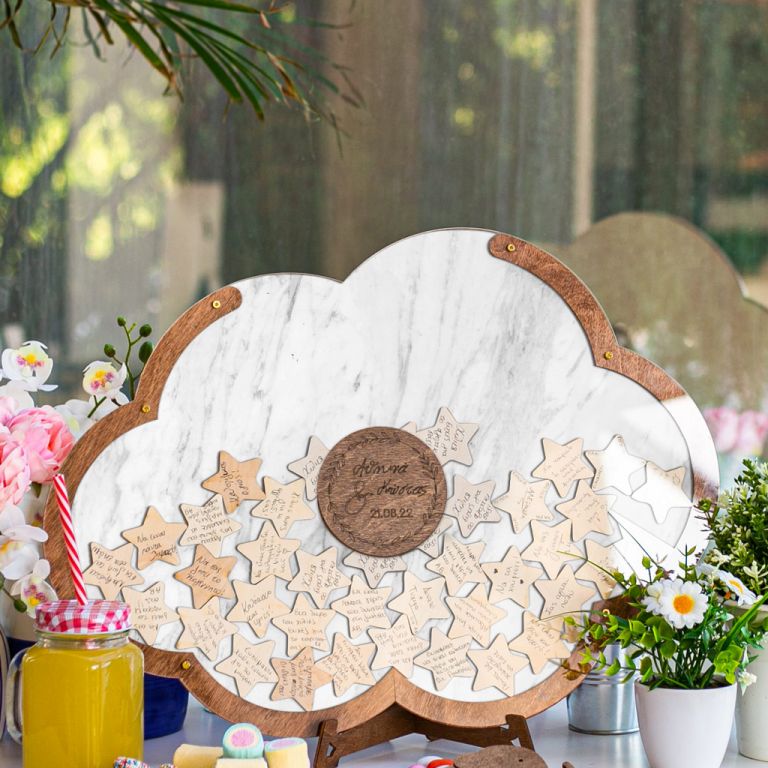 Κρατήστε τις ευχές των αγαπημένων σας με τον πιο πρωτότυπο τρόπο. Η ξύλινη κατασκευή λειτουργεί όπως ένας <<κουμπαράς>>. Προσωποποιήστε το ευχολόγιο βάπτισης με το όνομα του παιδιού και την ημερομηνία του μυστηρίου.