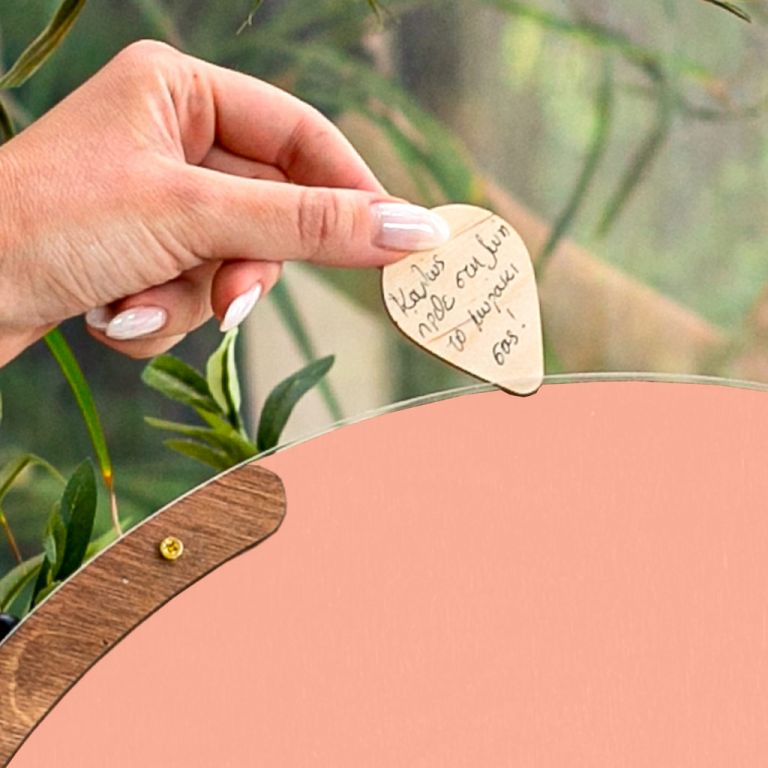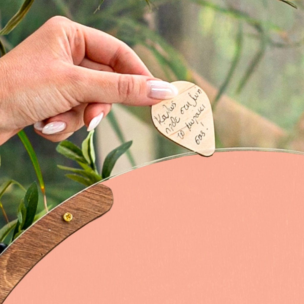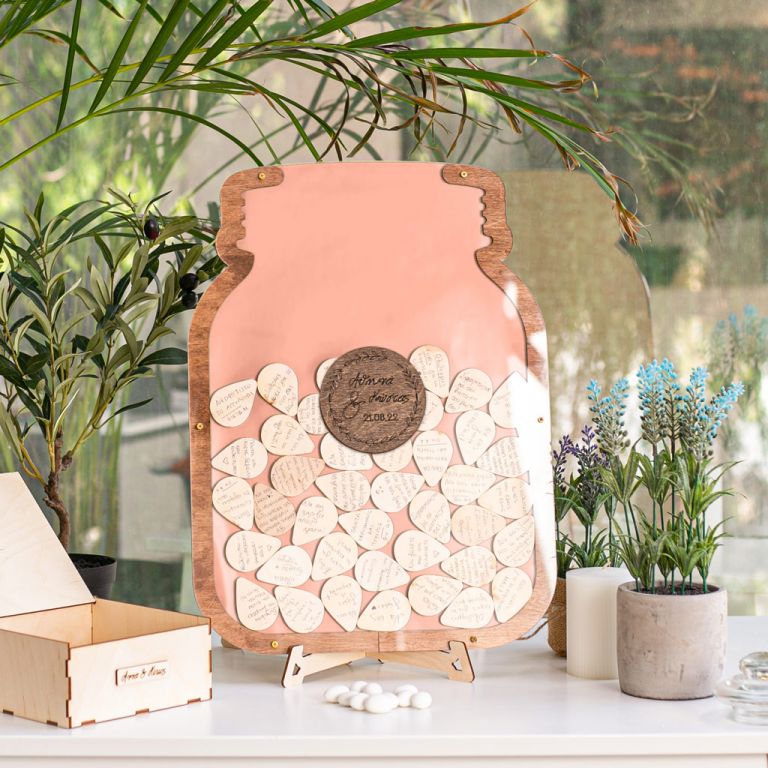 Κρατήστε τις ευχές των αγαπημένων σας με τον πιο πρωτότυπο τρόπο. Η ξύλινη κατασκευή λειτουργεί όπως ένας <<κουμπαράς>>. Προσωποποιήστε το ευχολόγιο με το ονόματά σας & την ημερομηνία του μυστηρίου.