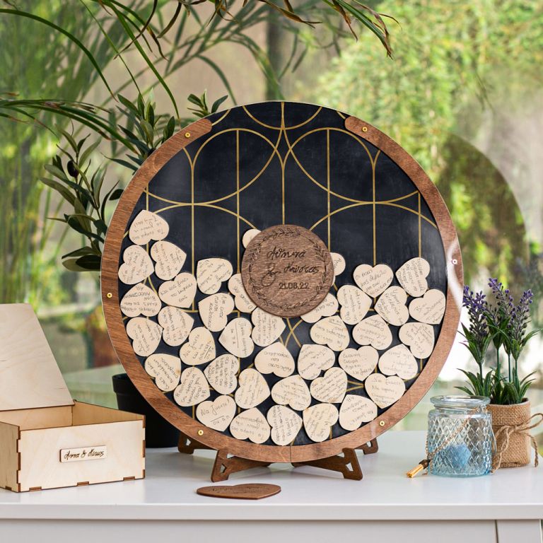 Κρατήστε τις ευχές των αγαπημένων σας με τον πιο πρωτότυπο τρόπο. Η ξύλινη κατασκευή λειτουργεί όπως ένας <<κουμπαράς>>. Προσωποποιήστε το ευχολόγιο με το ονόματά σας & την ημερομηνία του μυστηρίου.