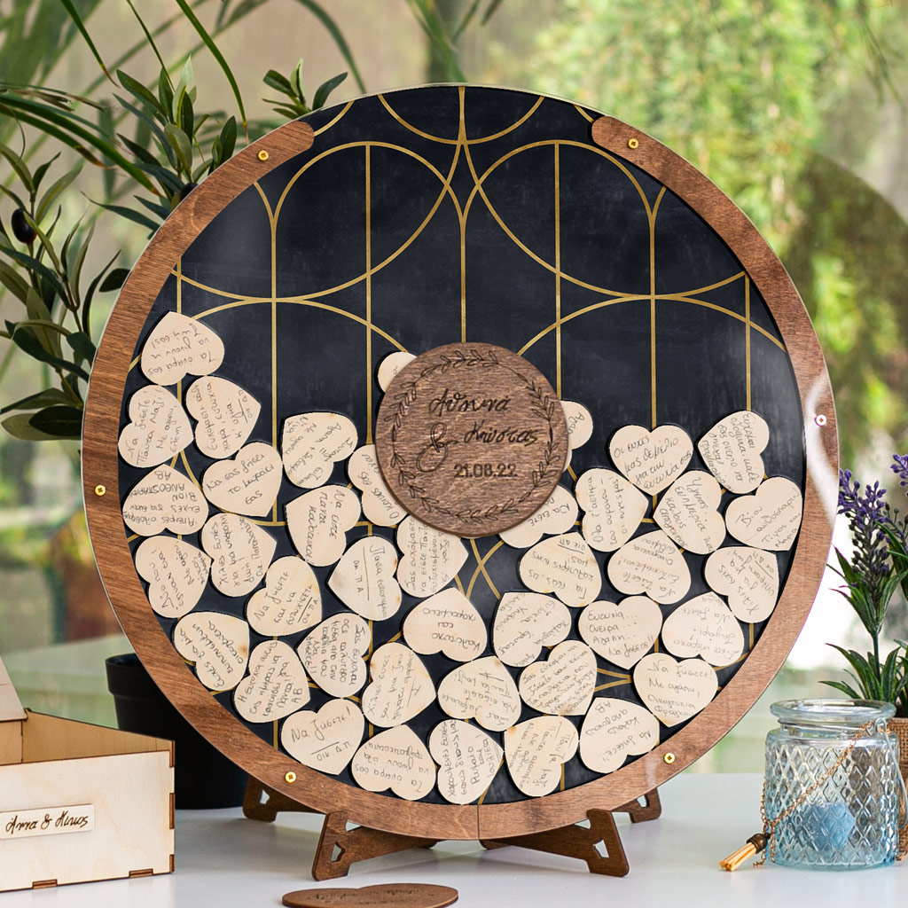 Κρατήστε τις ευχές των αγαπημένων σας με τον πιο πρωτότυπο τρόπο. Η ξύλινη κατασκευή λειτουργεί όπως ένας <<κουμπαράς>>. Προσωποποιήστε το ευχολόγιο με το ονόματά σας & την ημερομηνία του μυστηρίου.