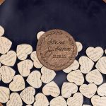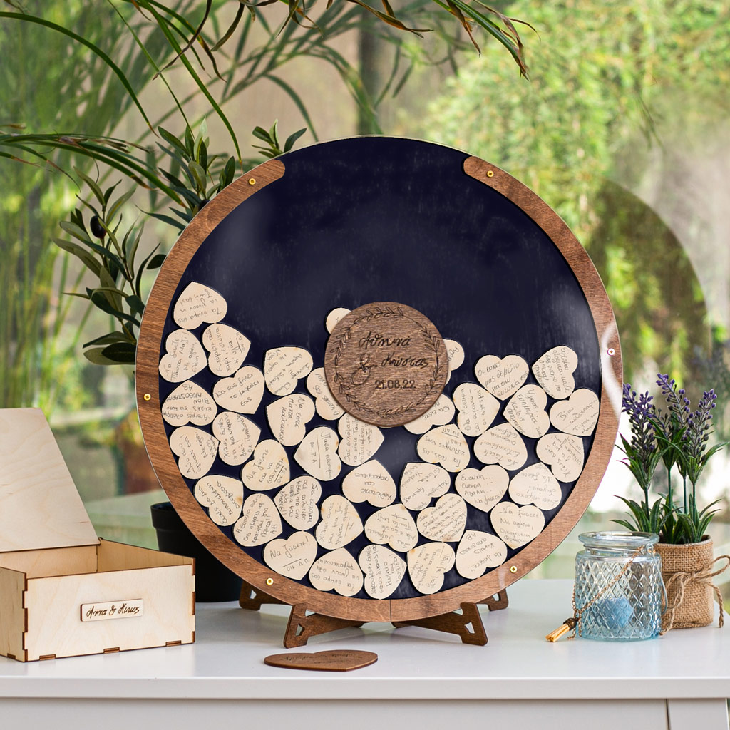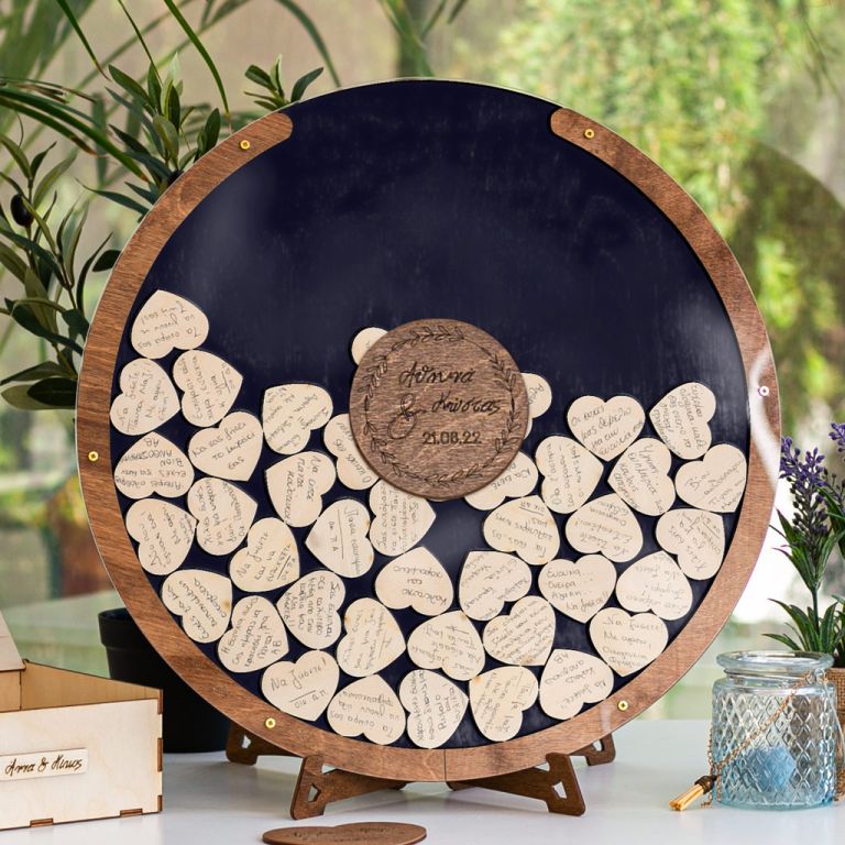 Κρατήστε τις ευχές των αγαπημένων σας με τον πιο πρωτότυπο τρόπο. Η ξύλινη κατασκευή λειτουργεί όπως ένας <<κουμπαράς>>. Προσωποποιήστε το ευχολόγιο με το ονόματά σας & την ημερομηνία του μυστηρίου.