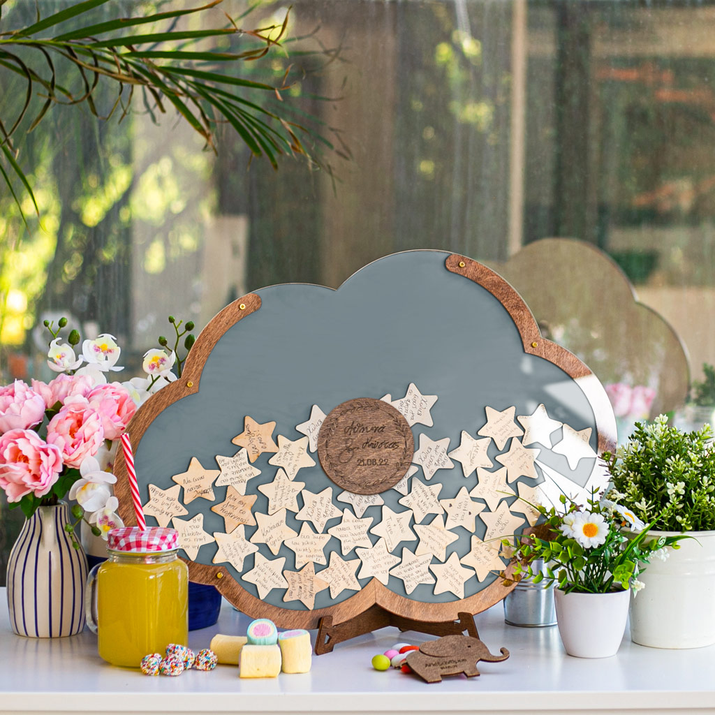 Κρατήστε τις ευχές των αγαπημένων σας με τον πιο πρωτότυπο τρόπο. Η ξύλινη κατασκευή λειτουργεί όπως ένας <<κουμπαράς>>. Προσωποποιήστε το ευχολόγιο βάπτισης με το όνομα του παιδιού και την ημερομηνία του μυστηρίου.