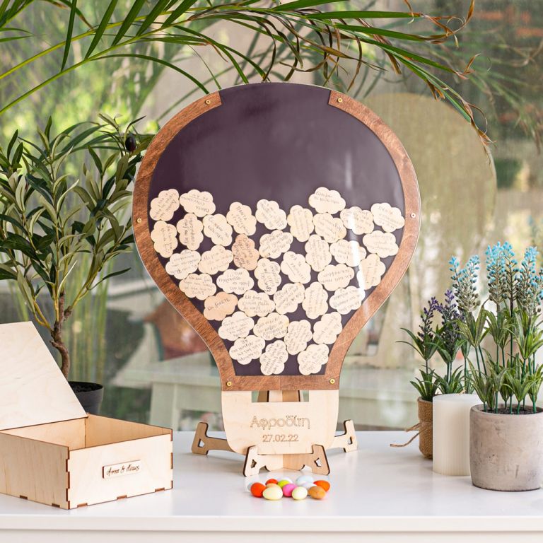 Κρατήστε τις ευχές των αγαπημένων σας με τον πιο πρωτότυπο τρόπο. Η ξύλινη κατασκευή λειτουργεί όπως ένας <<κουμπαράς>>. Προσωποποιήστε το ευχολόγιο βάπτισης με το όνομα του παιδιού και την ημερομηνία του μυστηρίου.