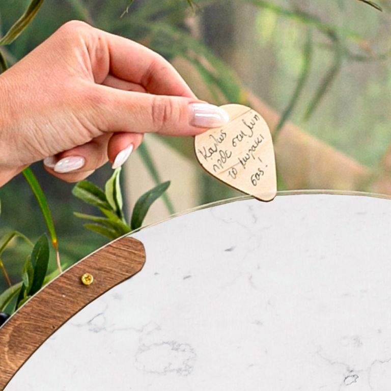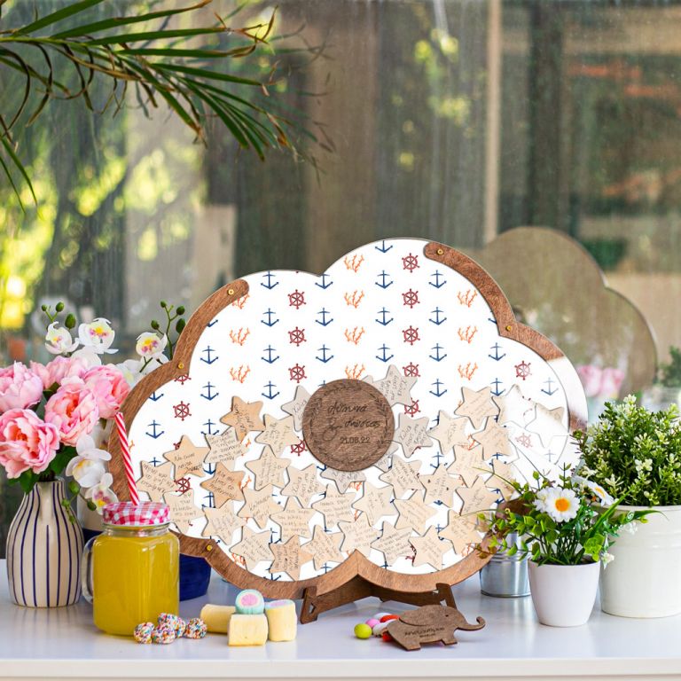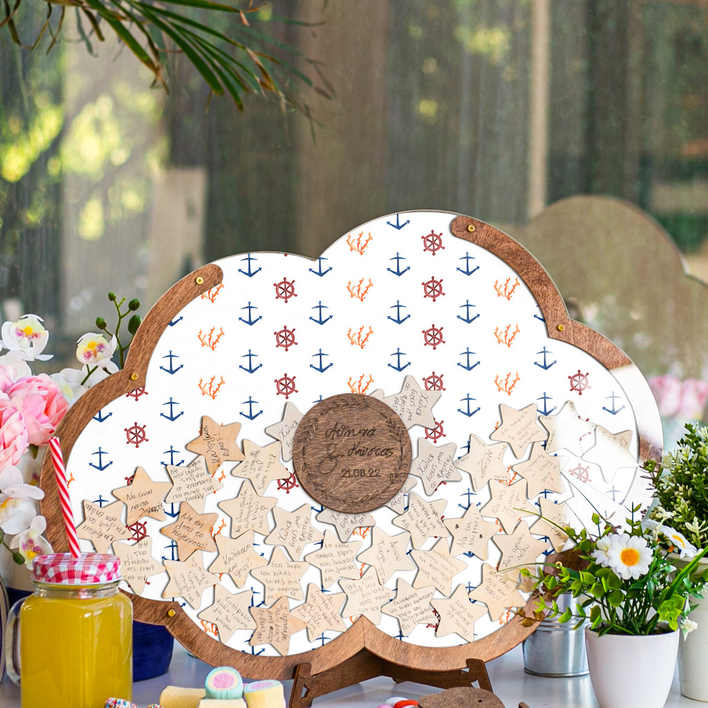 Κρατήστε τις ευχές των αγαπημένων σας με τον πιο πρωτότυπο τρόπο. Η ξύλινη κατασκευή λειτουργεί όπως ένας <<κουμπαράς>>. Προσωποποιήστε το ευχολόγιο βάπτισης με το όνομα του παιδιού και την ημερομηνία του μυστηρίου.