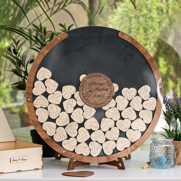 Κρατήστε τις ευχές των αγαπημένων σας με τον πιο πρωτότυπο τρόπο. Η ξύλινη κατασκευή λειτουργεί όπως ένας <<κουμπαράς>>. Προσωποποιήστε το ευχολόγιο με το ονόματά σας & την ημερομηνία του μυστηρίου.