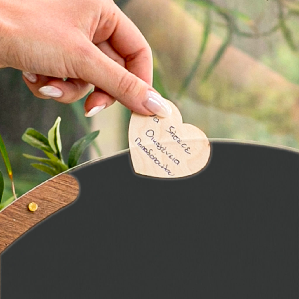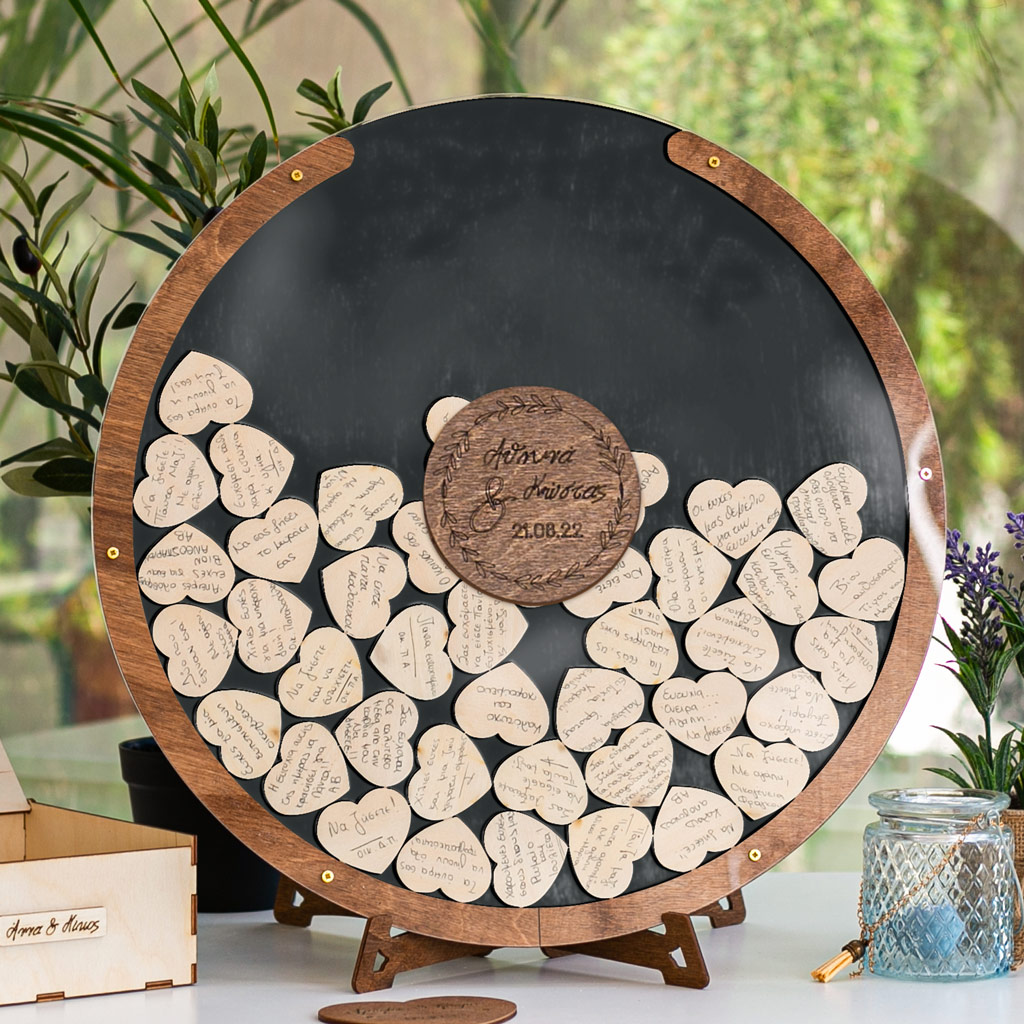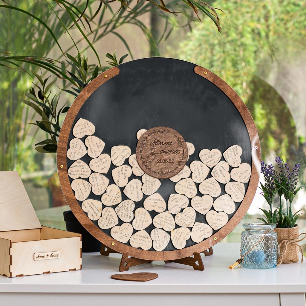 Κρατήστε τις ευχές των αγαπημένων σας με τον πιο πρωτότυπο τρόπο. Η ξύλινη κατασκευή λειτουργεί όπως ένας <<κουμπαράς>>. Προσωποποιήστε το ευχολόγιο με το ονόματά σας & την ημερομηνία του μυστηρίου.