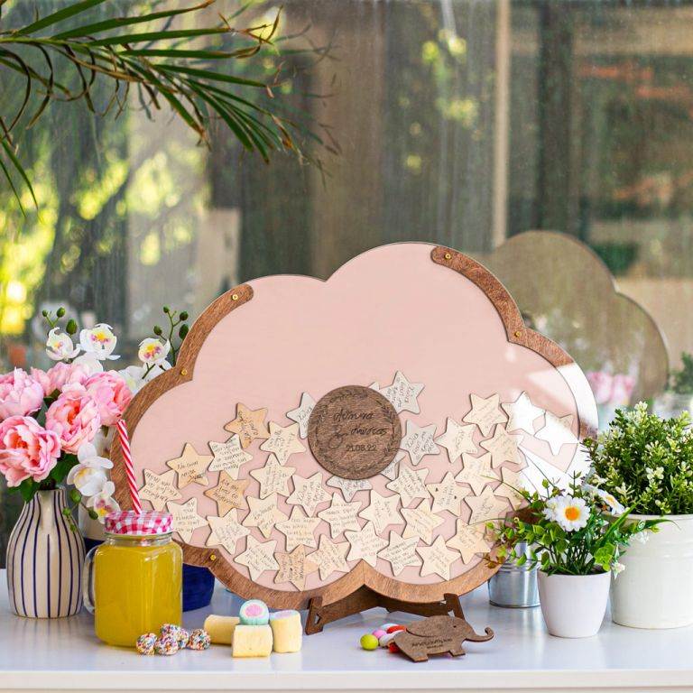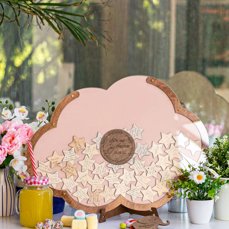 Κρατήστε τις ευχές των αγαπημένων σας με τον πιο πρωτότυπο τρόπο. Η ξύλινη κατασκευή λειτουργεί όπως ένας <<κουμπαράς>>. Προσωποποιήστε το ευχολόγιο βάπτισης με το όνομα του παιδιού και την ημερομηνία του μυστηρίου.
