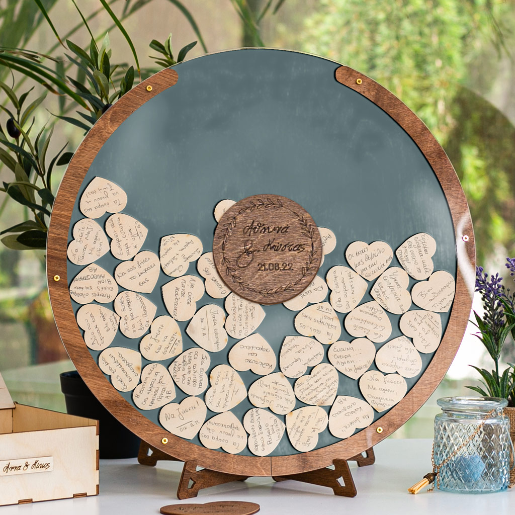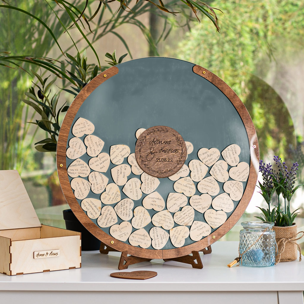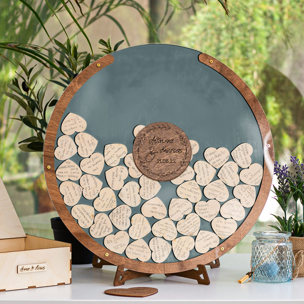 Κρατήστε τις ευχές των αγαπημένων σας με τον πιο πρωτότυπο τρόπο. Η ξύλινη κατασκευή λειτουργεί όπως ένας <<κουμπαράς>>. Προσωποποιήστε το ευχολόγιο με το ονόματά σας & την ημερομηνία του μυστηρίου.