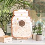 Κρατήστε τις ευχές των αγαπημένων σας με τον πιο πρωτότυπο τρόπο. Η ξύλινη κατασκευή λειτουργεί όπως ένας <<κουμπαράς>>. Προσωποποιήστε το ευχολόγιο με το ονόματά σας & την ημερομηνία του μυστηρίου.