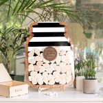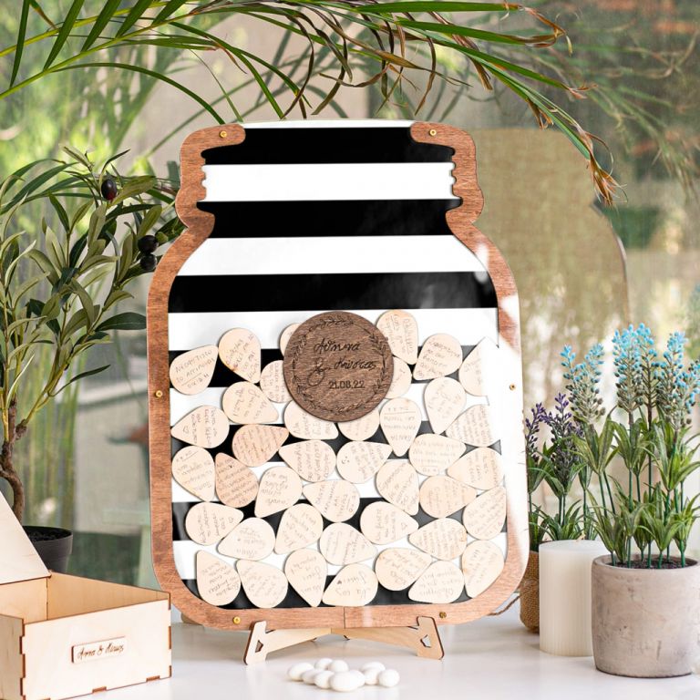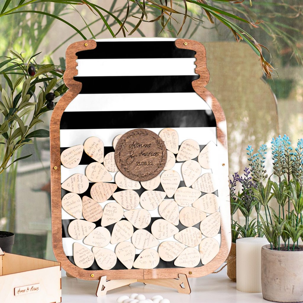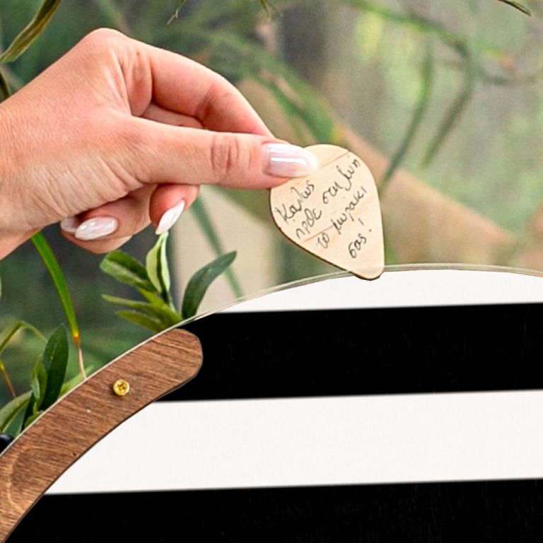Κρατήστε τις ευχές των αγαπημένων σας με τον πιο πρωτότυπο τρόπο. Η ξύλινη κατασκευή λειτουργεί όπως ένας <<κουμπαράς>>. Προσωποποιήστε το ευχολόγιο με το ονόματά σας & την ημερομηνία του μυστηρίου.