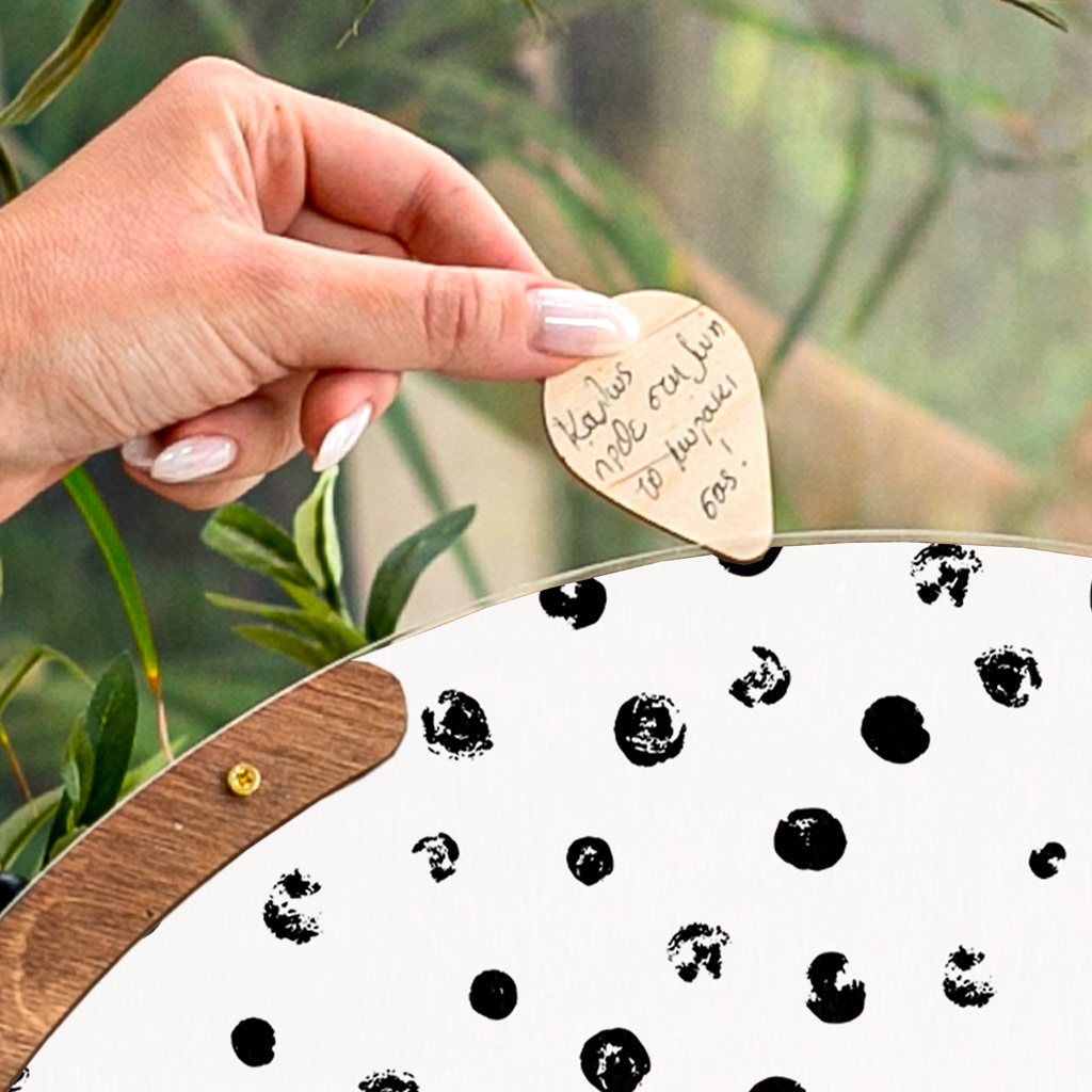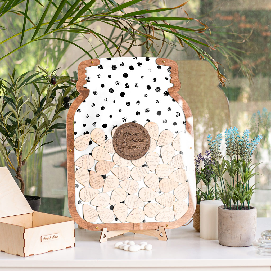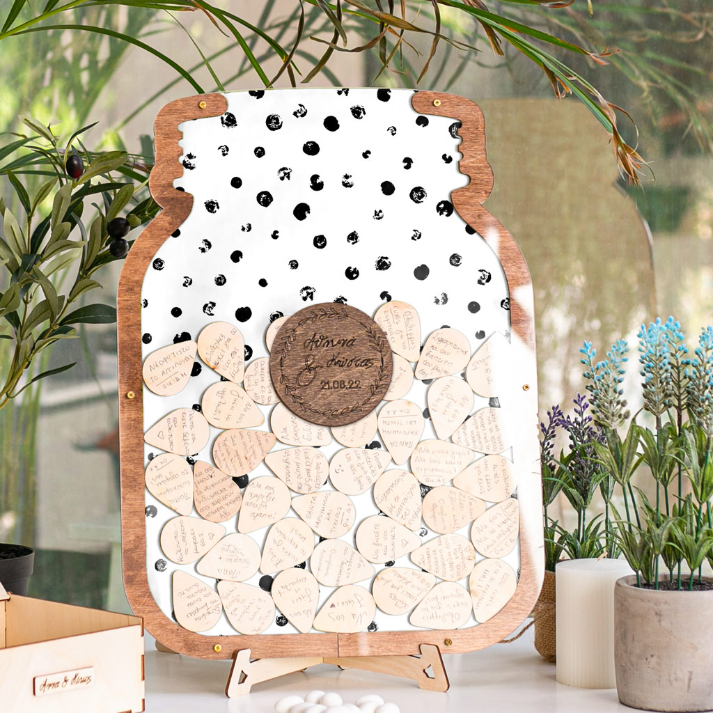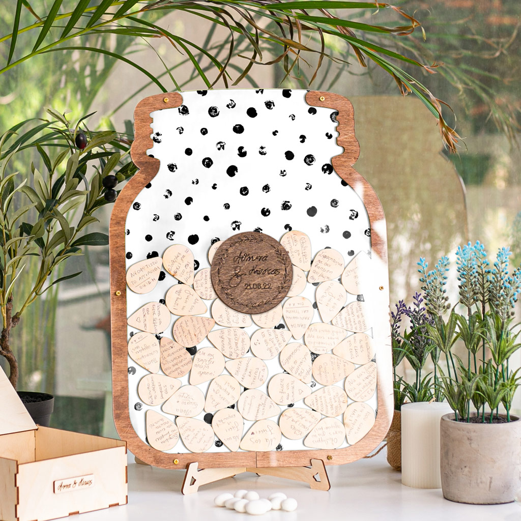 Κρατήστε τις ευχές των αγαπημένων σας με τον πιο πρωτότυπο τρόπο. Η ξύλινη κατασκευή λειτουργεί όπως ένας <<κουμπαράς>>. Προσωποποιήστε το ευχολόγιο με το ονόματά σας & την ημερομηνία του μυστηρίου.